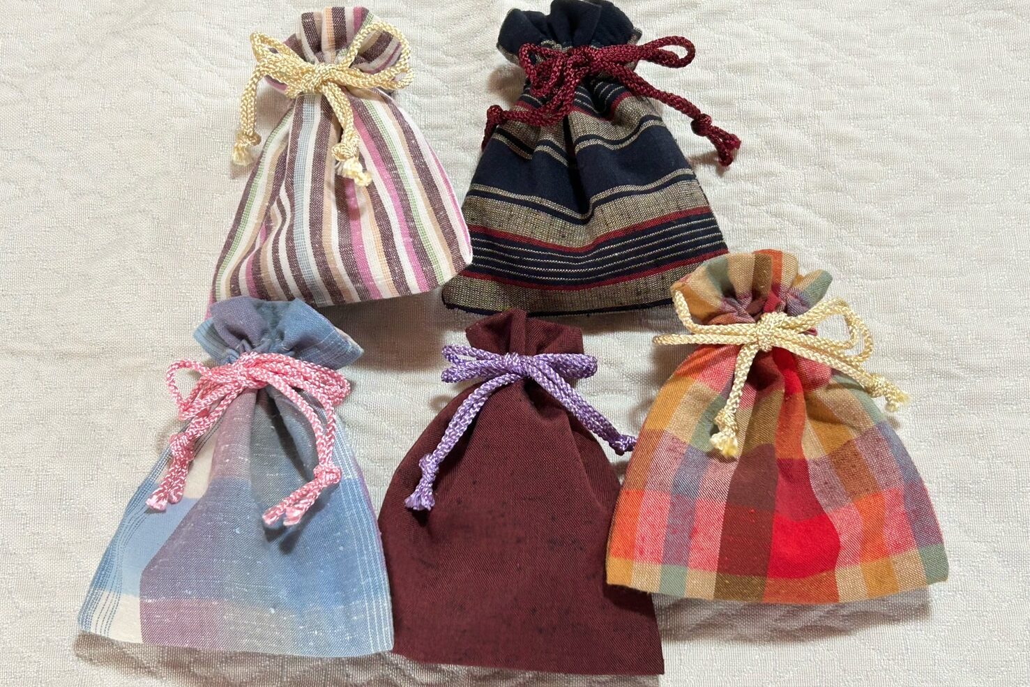 巾着袋と紐はお好きなものをお選びいただきます。既に袋は縫い上がっているので、紐を通して焙じた茶葉を、巾着袋に入れてポプリを作ります。