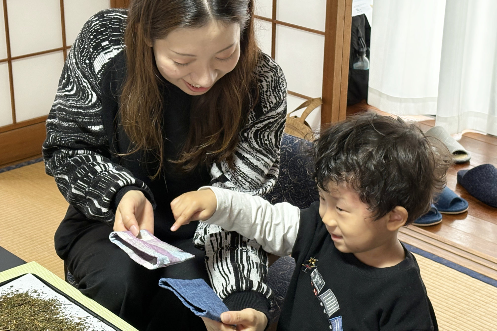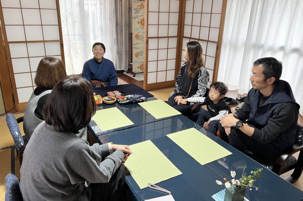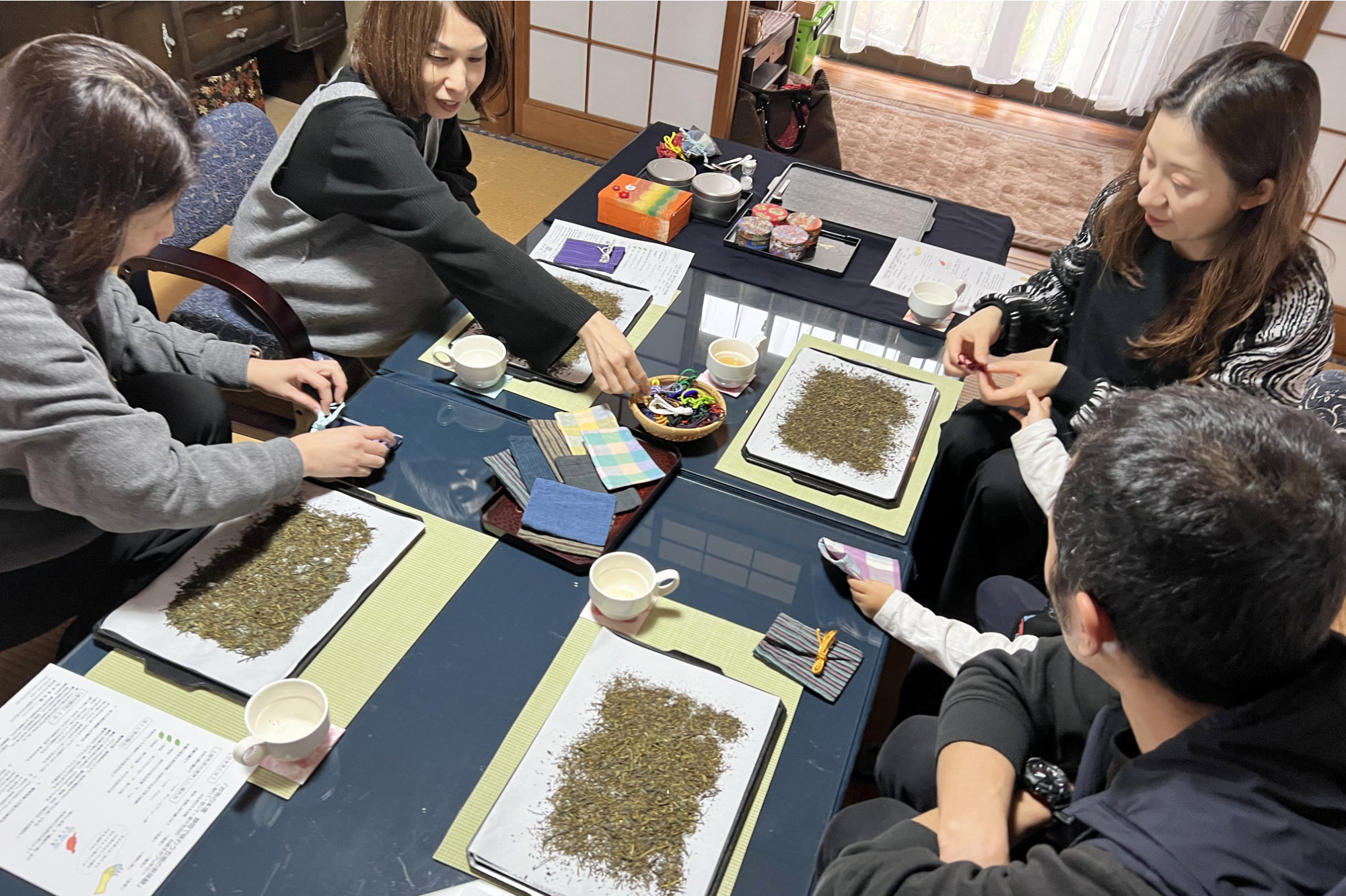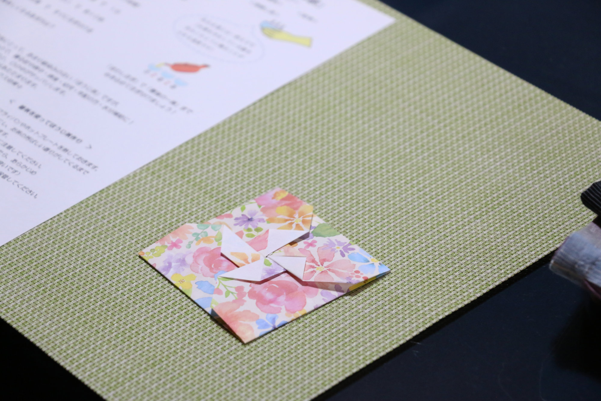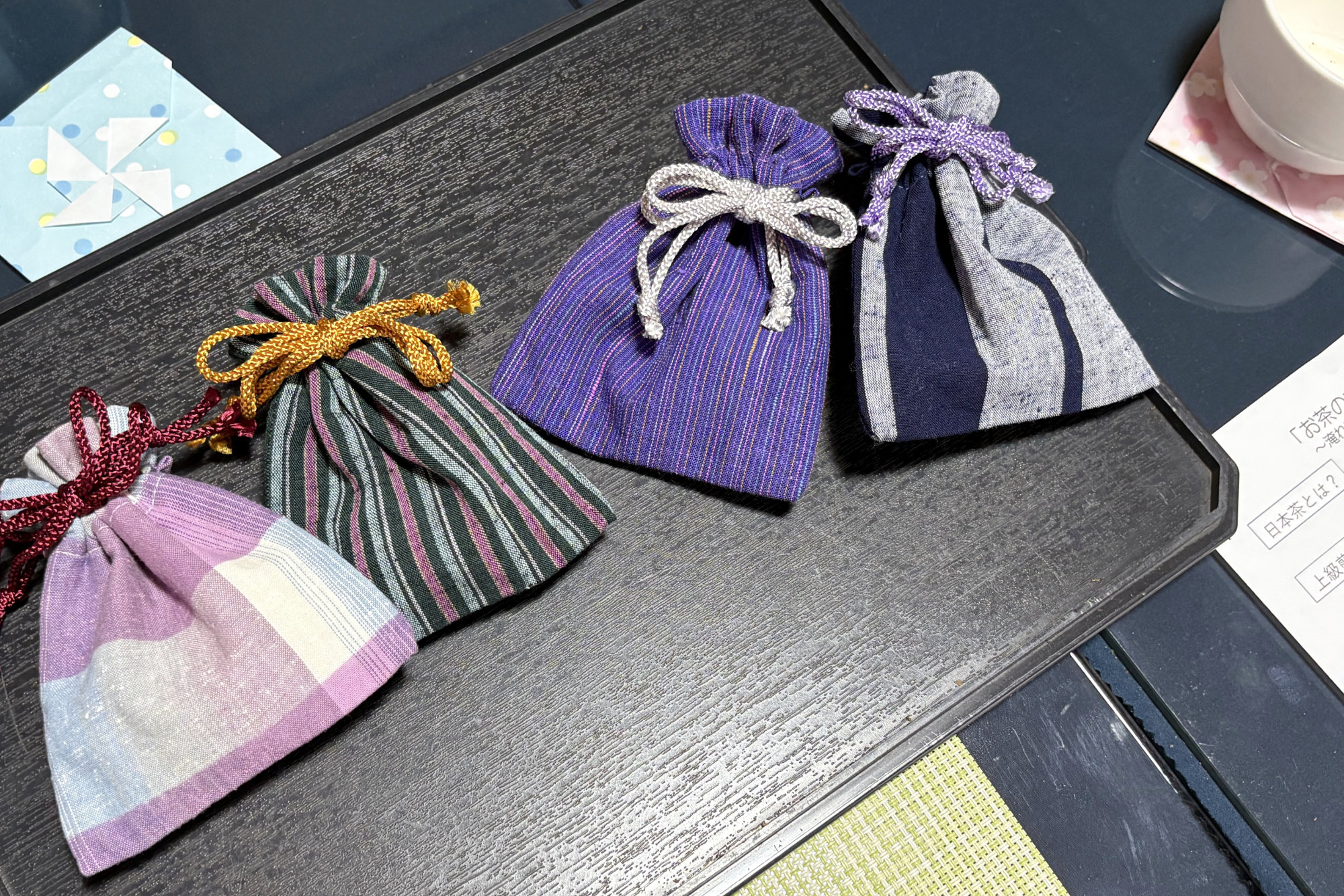 テーブルには、折り紙で作られた手作りのコースターも用意されています。好きな柄を選び、自分の湯呑の目印に。そんな小さなやりとりも、この体験の楽しいひとコマです。