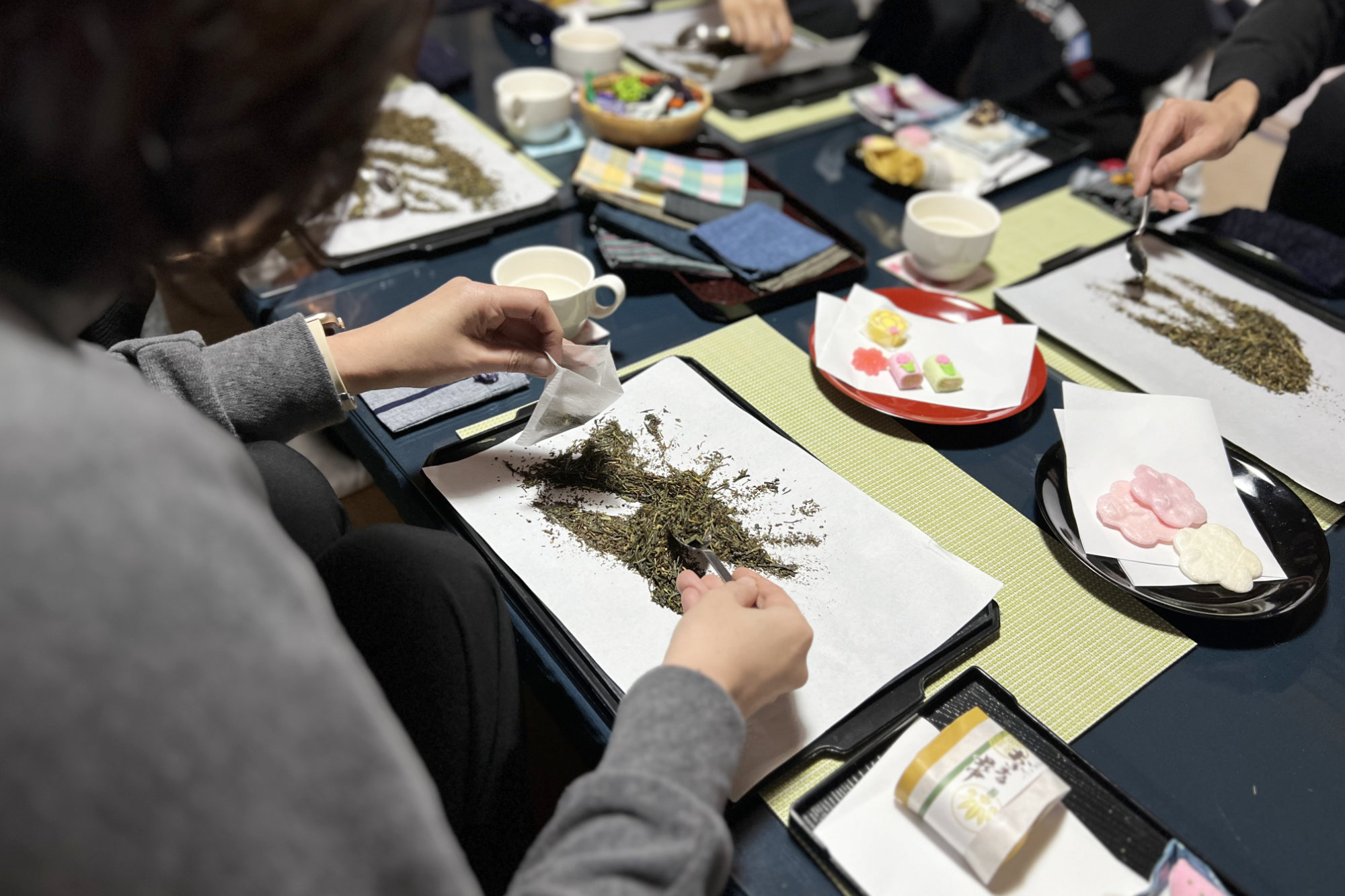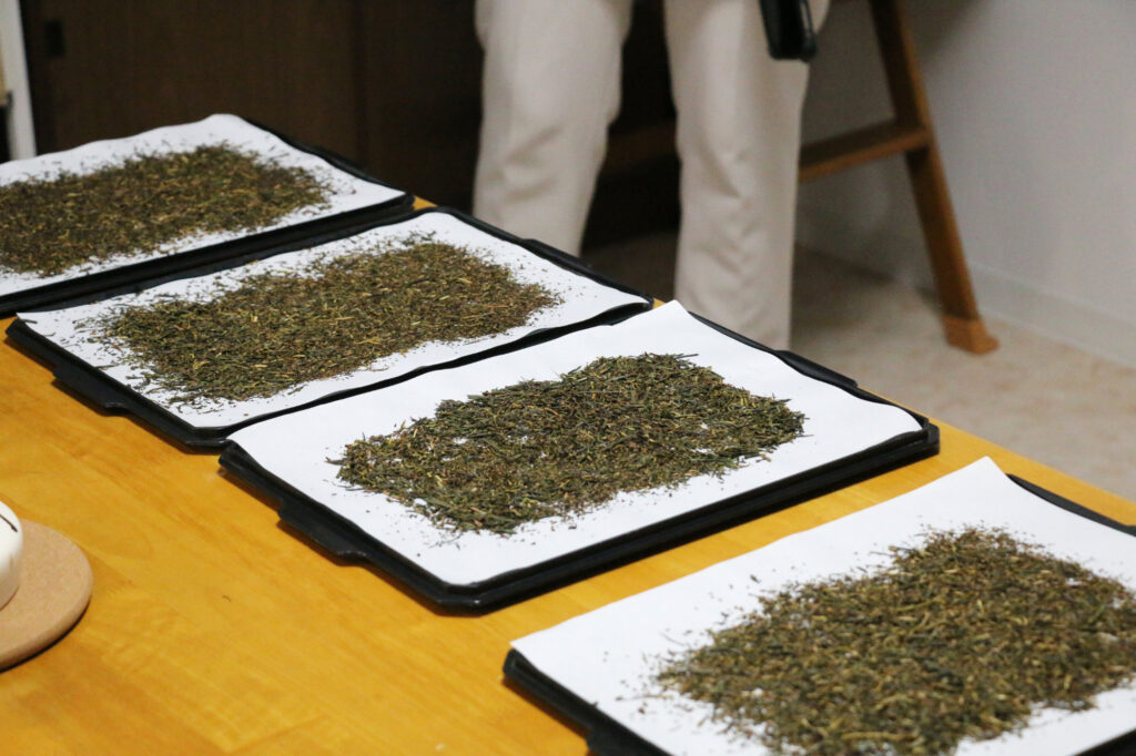 体験の締めくくりは、上級煎茶とお茶菓子の時間です。まずは二種類の上級煎茶の香りを確かめながら、好みの一杯を選ぶところから始まります。