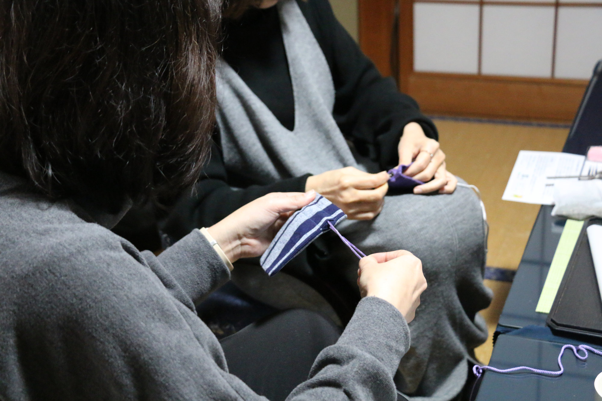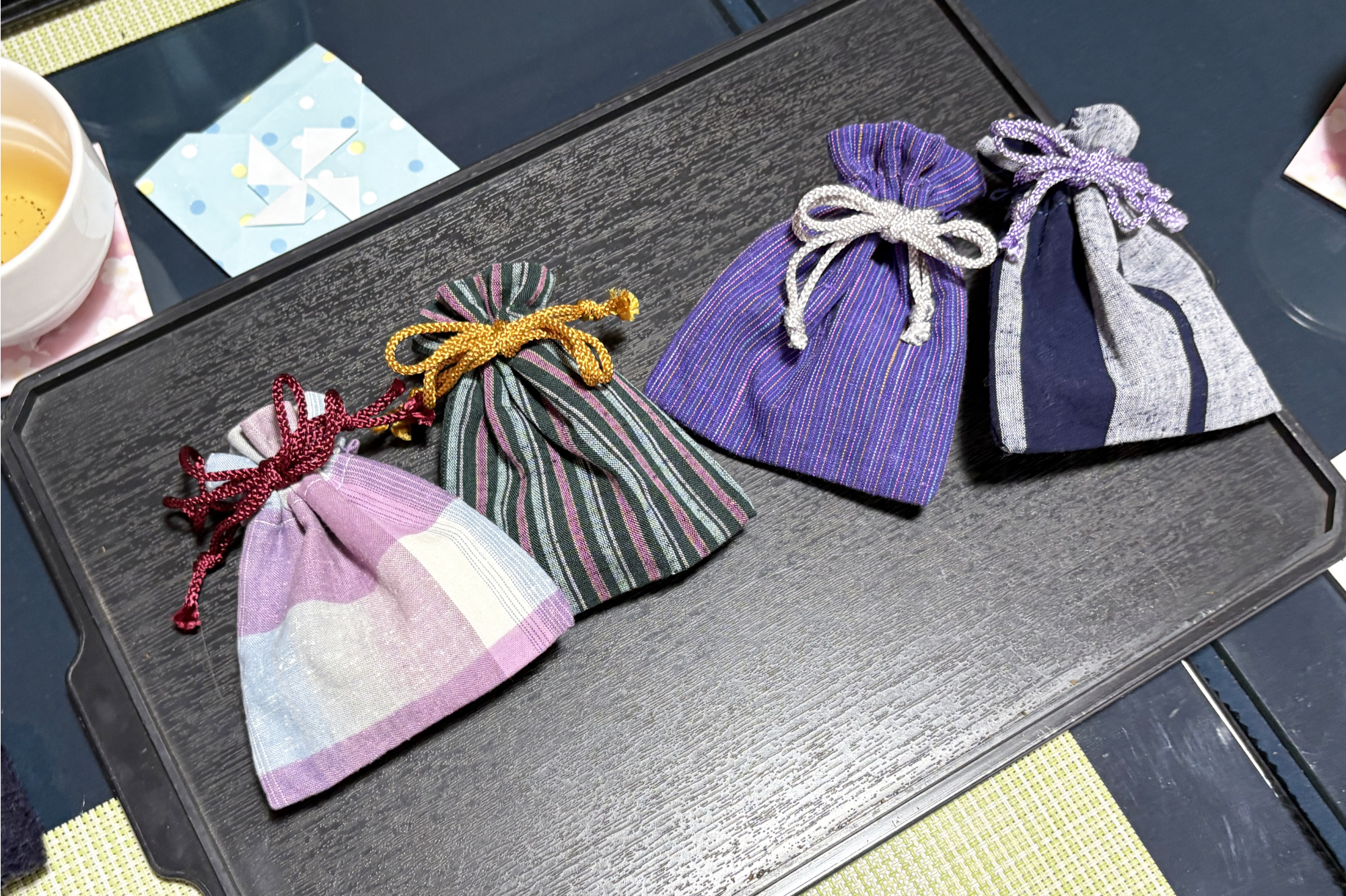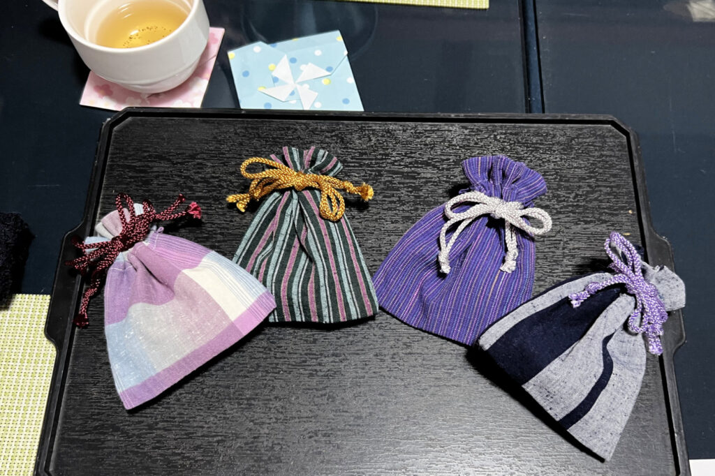 体験で行うのは、布の柄と紐の色を選び、焙じた茶葉を入れて、ひも通しで紐を通すというシンプルな工程です。巾着はあらかじめ仕立てられているため、難しい作業はありません。