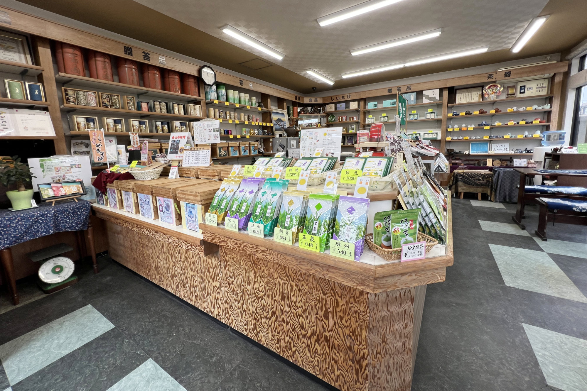 店内には、煎茶や深蒸し茶、和紅茶など、こだわりのお茶が並びます。