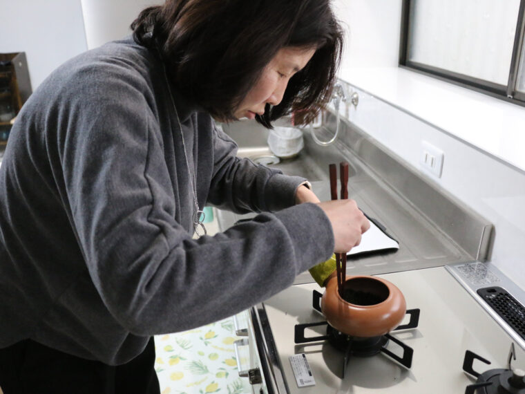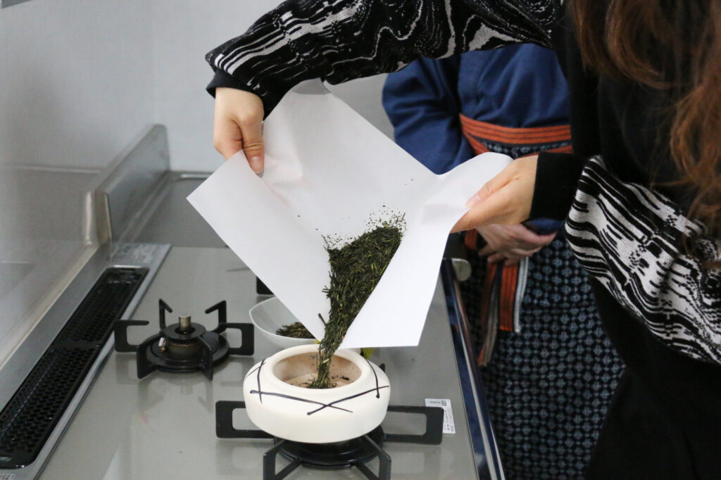 続いて行われるのが、焙烙(ほうろく)を使ったほうじ茶作りです。使うのは番茶。焙烙の上で茶葉を動かしていくと、芳ばしい香りが立ち上ります。