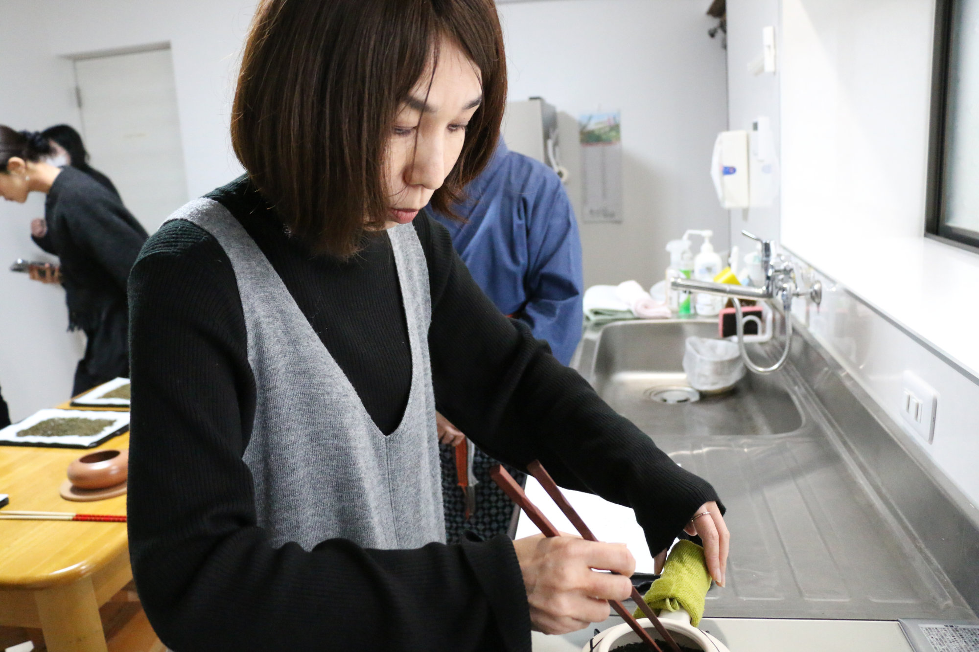 急須に入れる茶葉の量、湯の注ぎ方、そして最後の一滴まで注ぎきることの大切さ。松本さんの実演を見ながら、参加者も交代で「まわし注ぎ」を体験し、煎茶を淹れていきます。