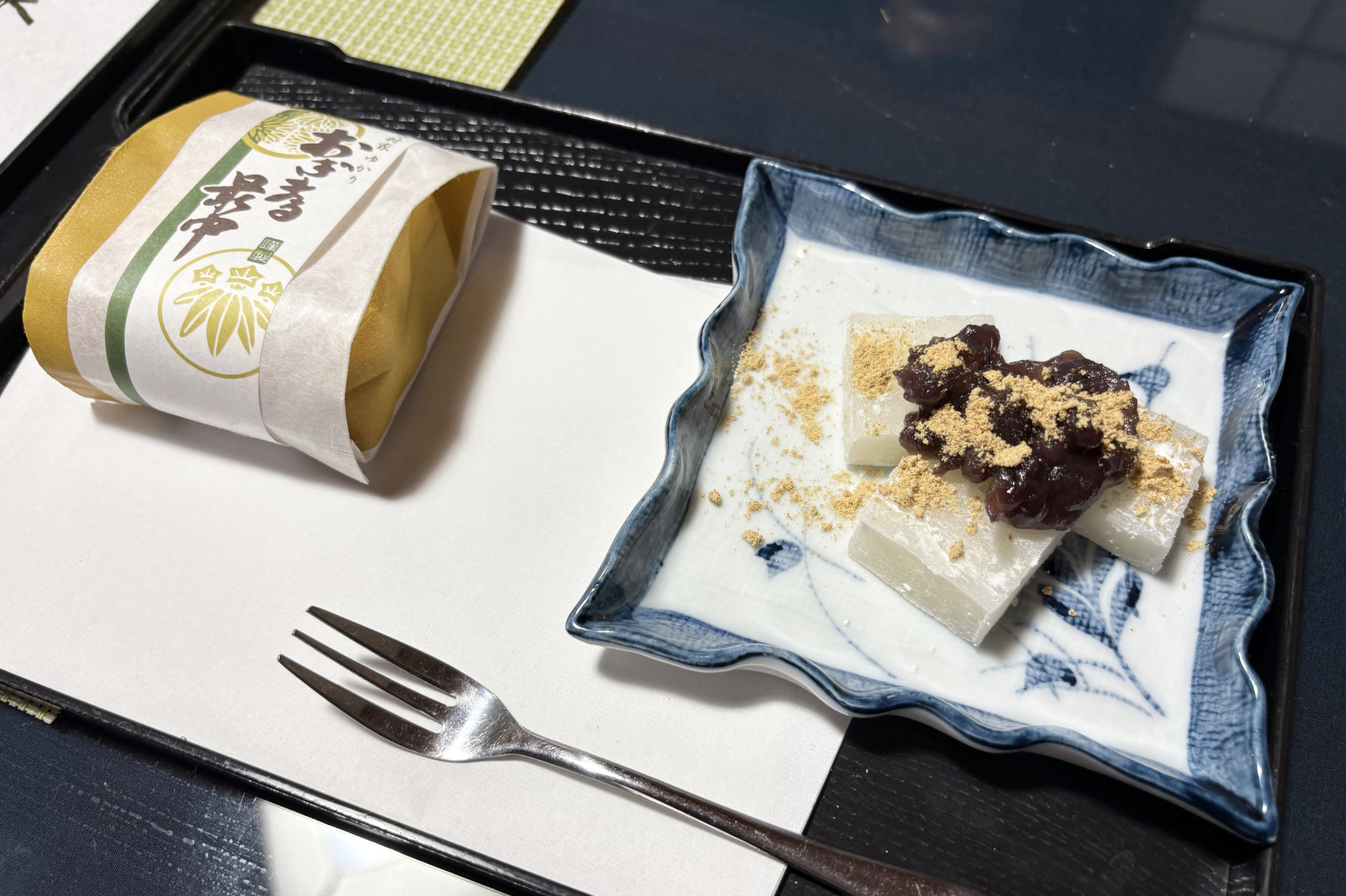 お茶菓子は日替わりで用意してくれます。この日はサービスとして、和菓子屋で働く松本さんの娘さんが作った求肥に、松本さん手作りのあんこを添えた一品も並びました。