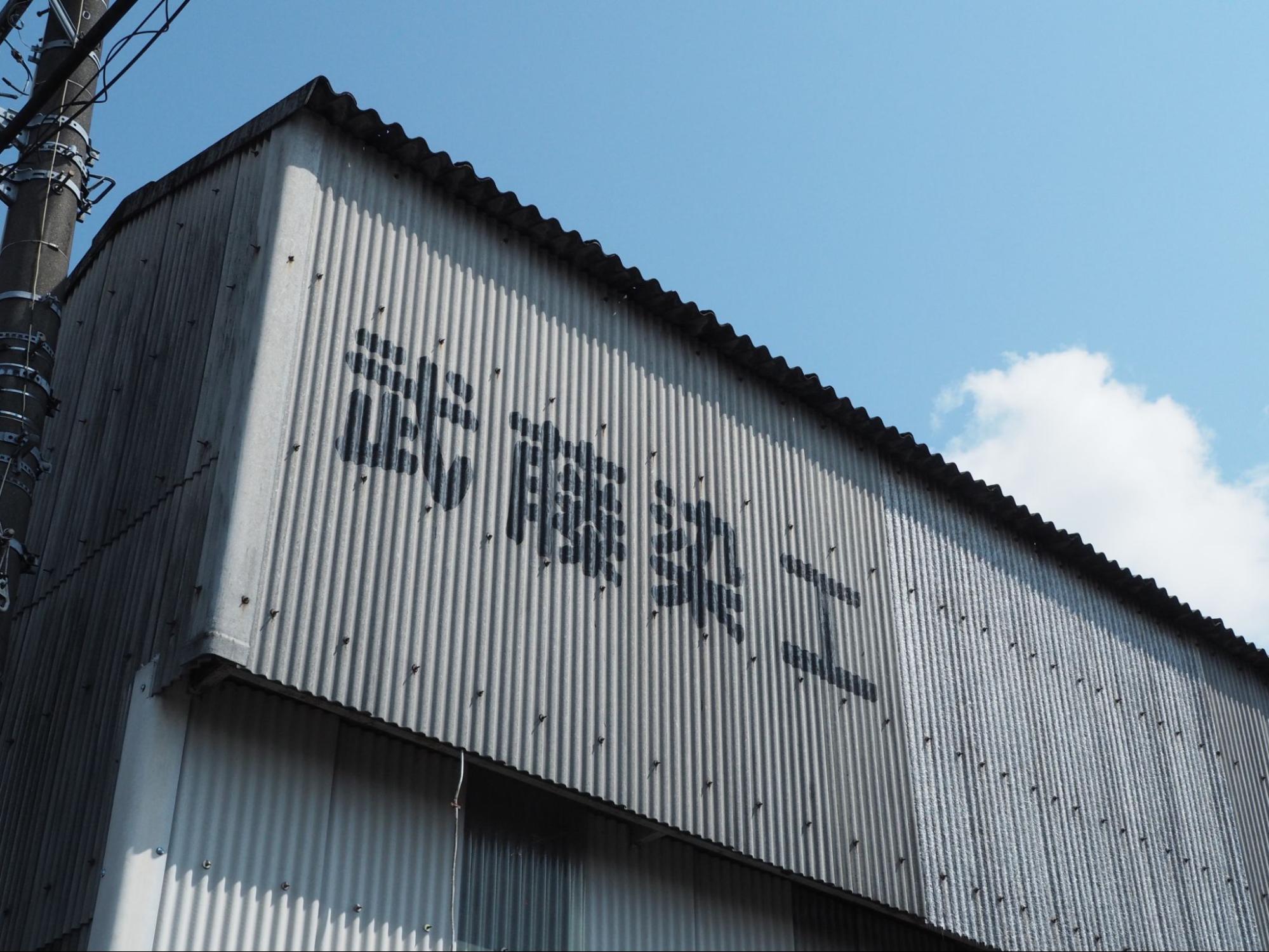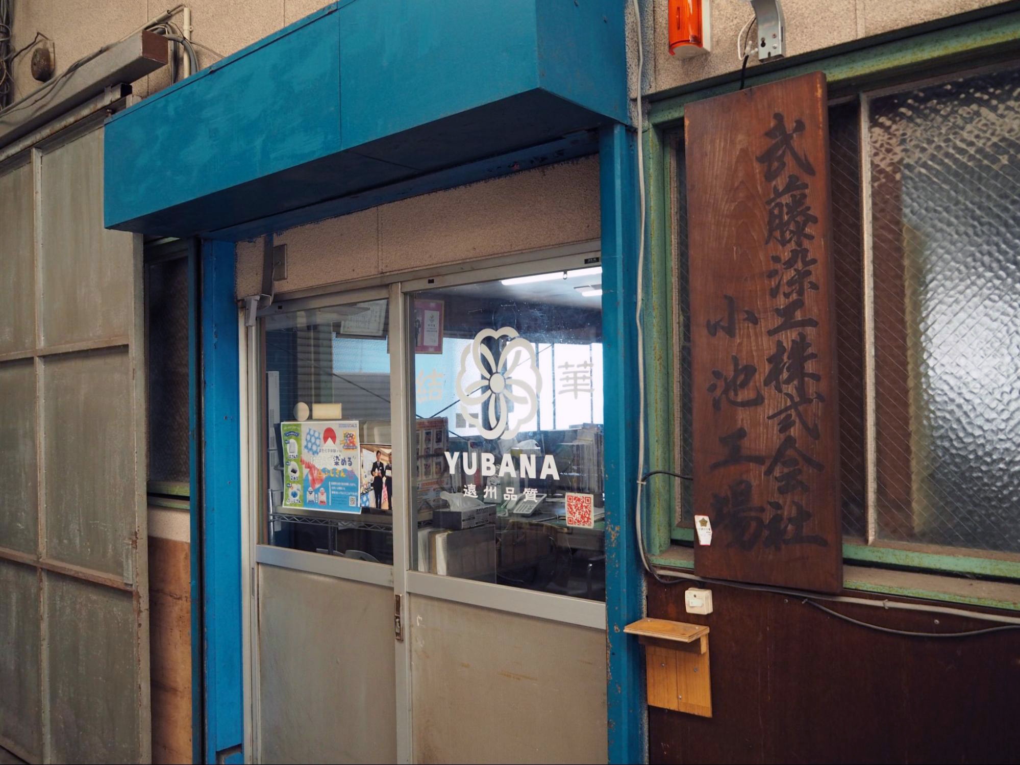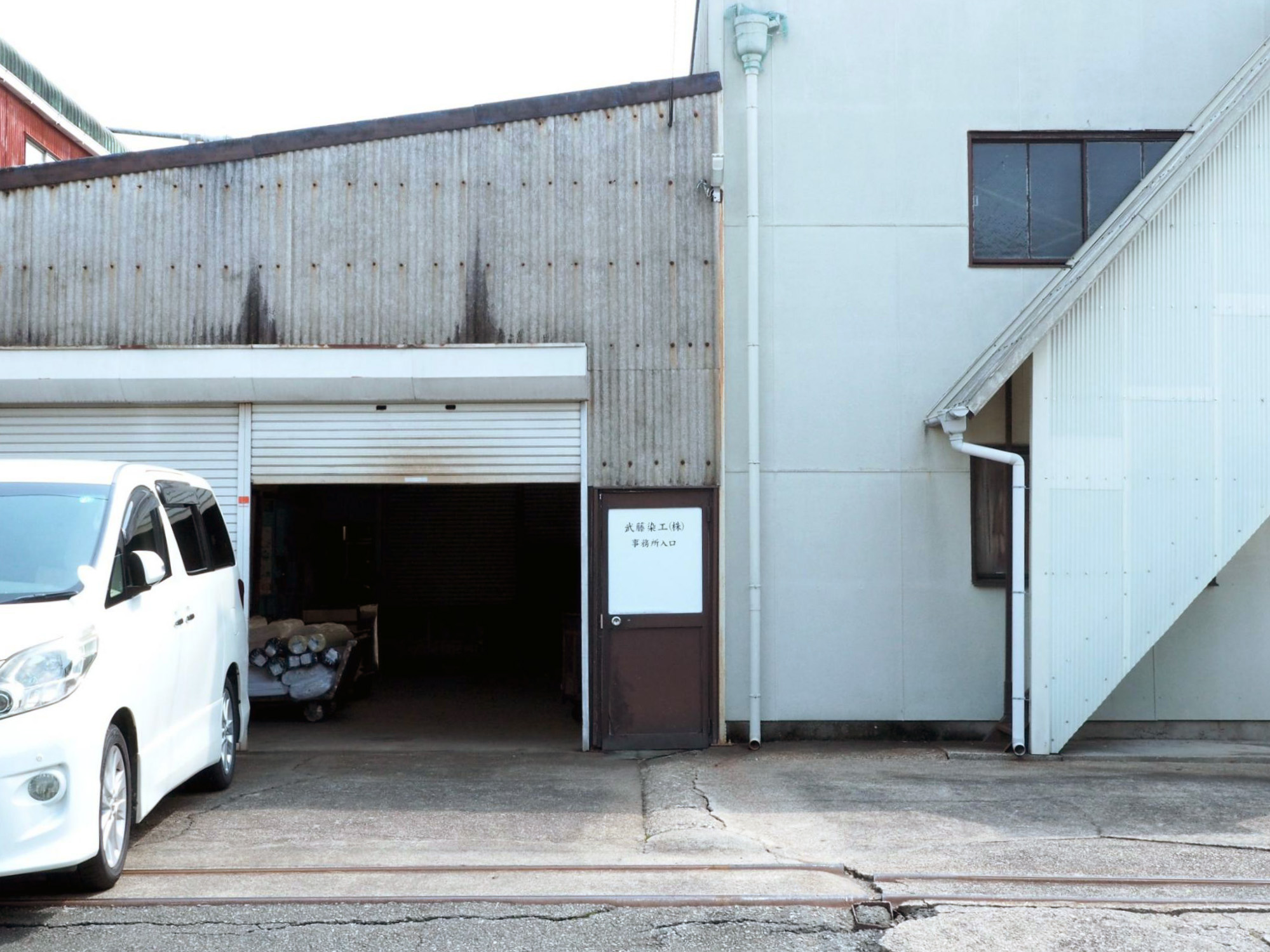主に捺染そめを手掛ける工場です。外壁に大きく描かれた「武藤染工」の文字が目印。