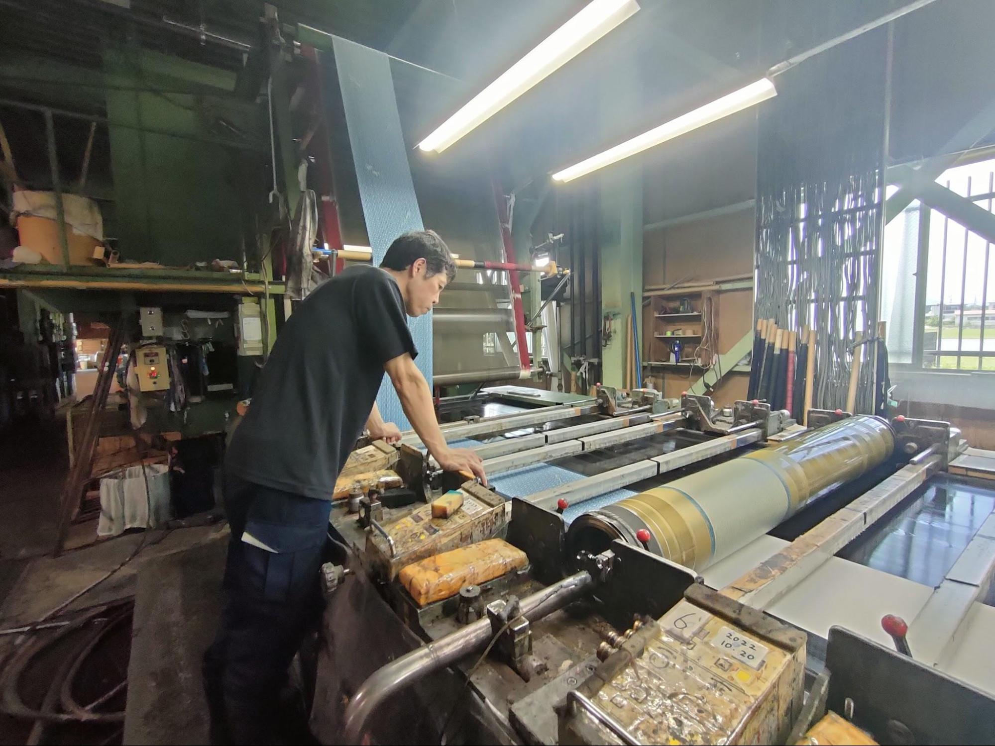染色工場では、夏には冬物を、冬には夏物の服地づくりを行なうのが慣例だといい、武藤染工さんに6月に訪れた際には、秋祭りの浴衣や法被の準備で大忙しでした。これほど大きな機械があっても、捺染前の細かな調整はすべて手作業。手際よく機械を使いこなす姿に職人技が光ります。