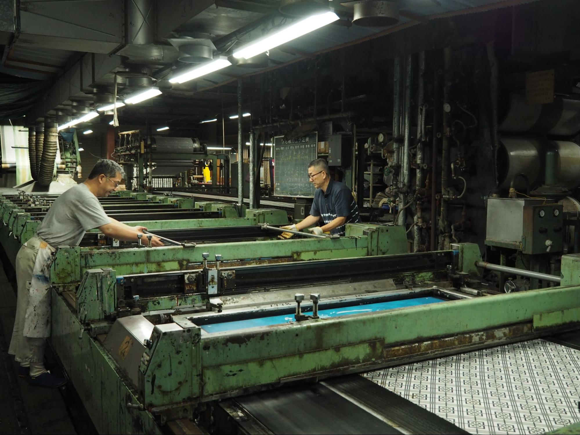 歴史を感じさせる染色機械の多くは捺染を自動で行うもの。捺染とは、染料を糊に溶かした色糊を使って型で生地に模様をプリントする、型染めの染色技法をさします。