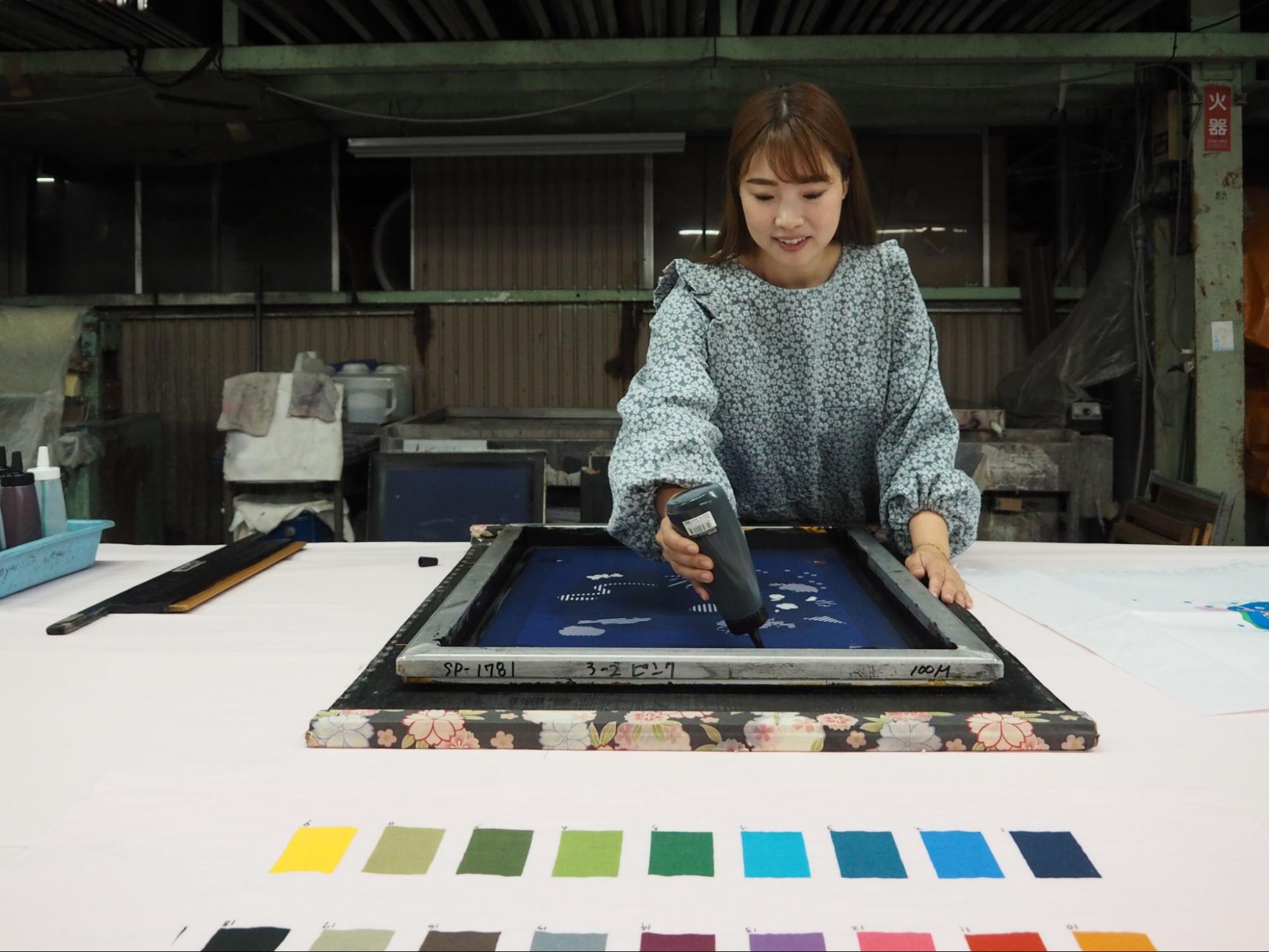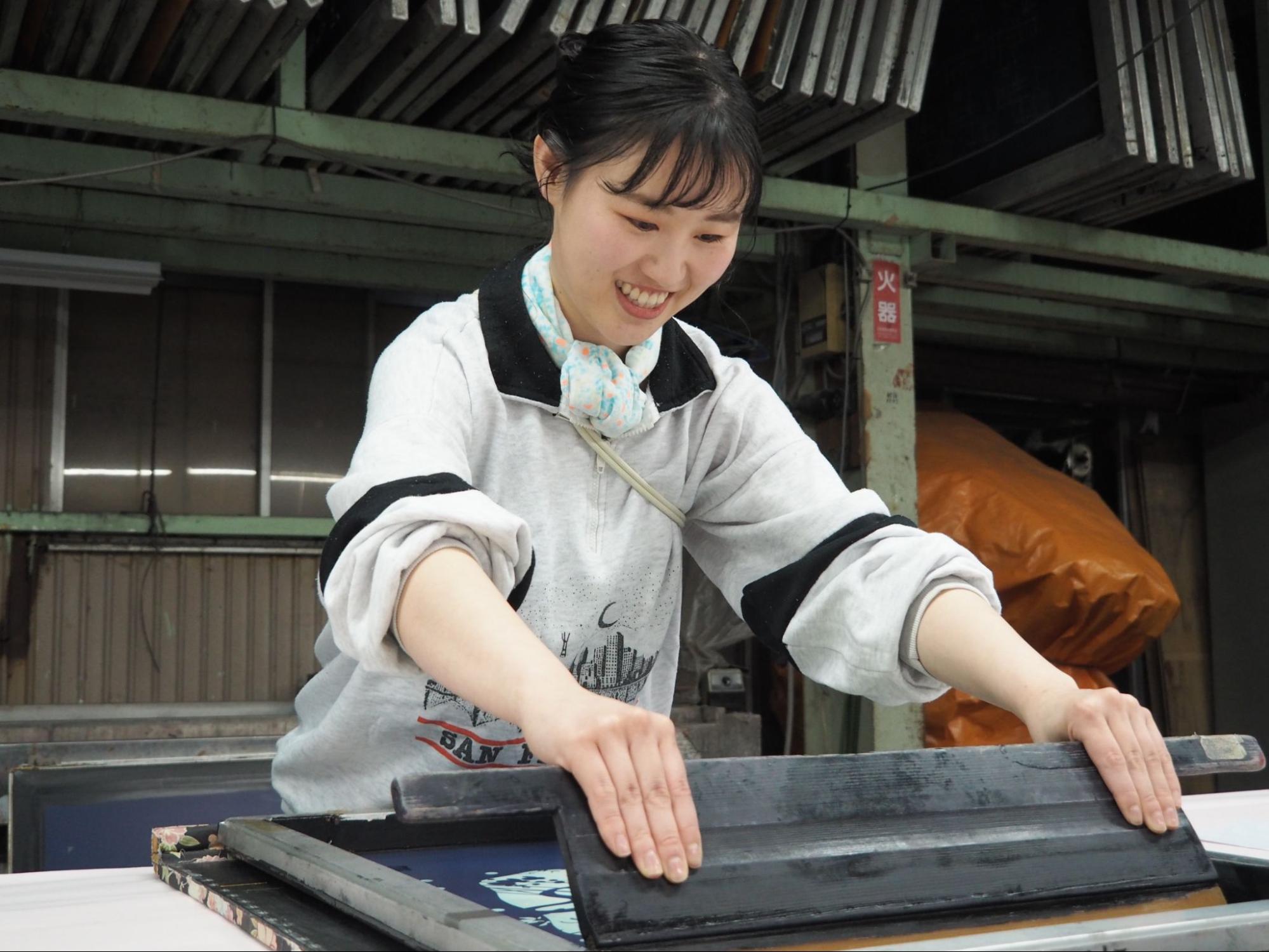 2人の職人が阿吽の呼吸でスキージ(版の上にインクを乗せてインクを押し出すためのゴム製のヘラ)を移動させて捺染します。職人の経験や感性によって仕上がりも変化するのだとか。
