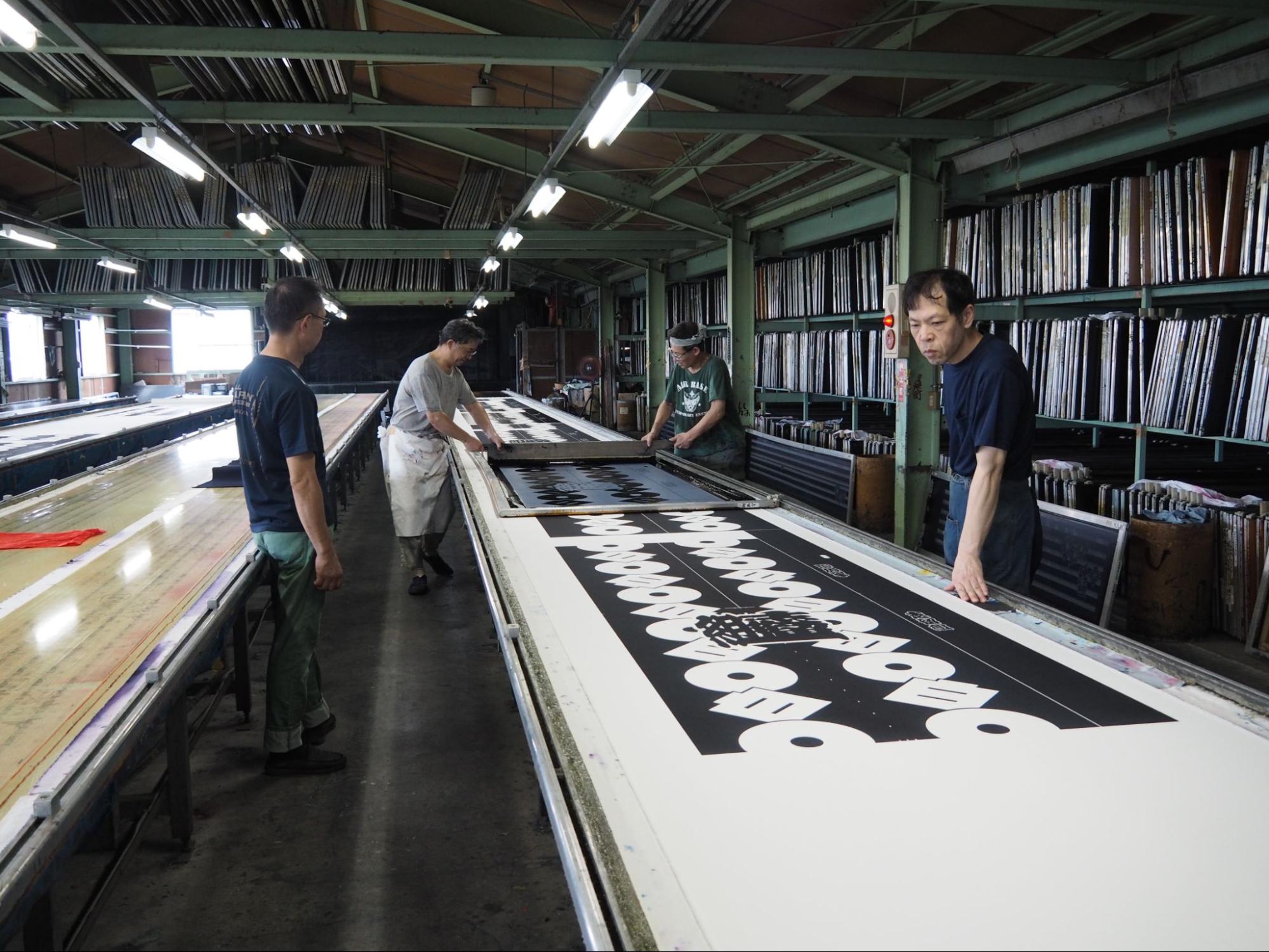 さらに工場の2階には、部屋一面に全長約25mにも及ぶ手捺染の作業台が広がります。1階とはまったく異なる光景に、思わず声をあげてしまうほど圧巻の大空間です。この手捺染台は、手ぬぐいや法被、踊り絵羽浴衣など、小幅の生地を捺染するために用いられています。