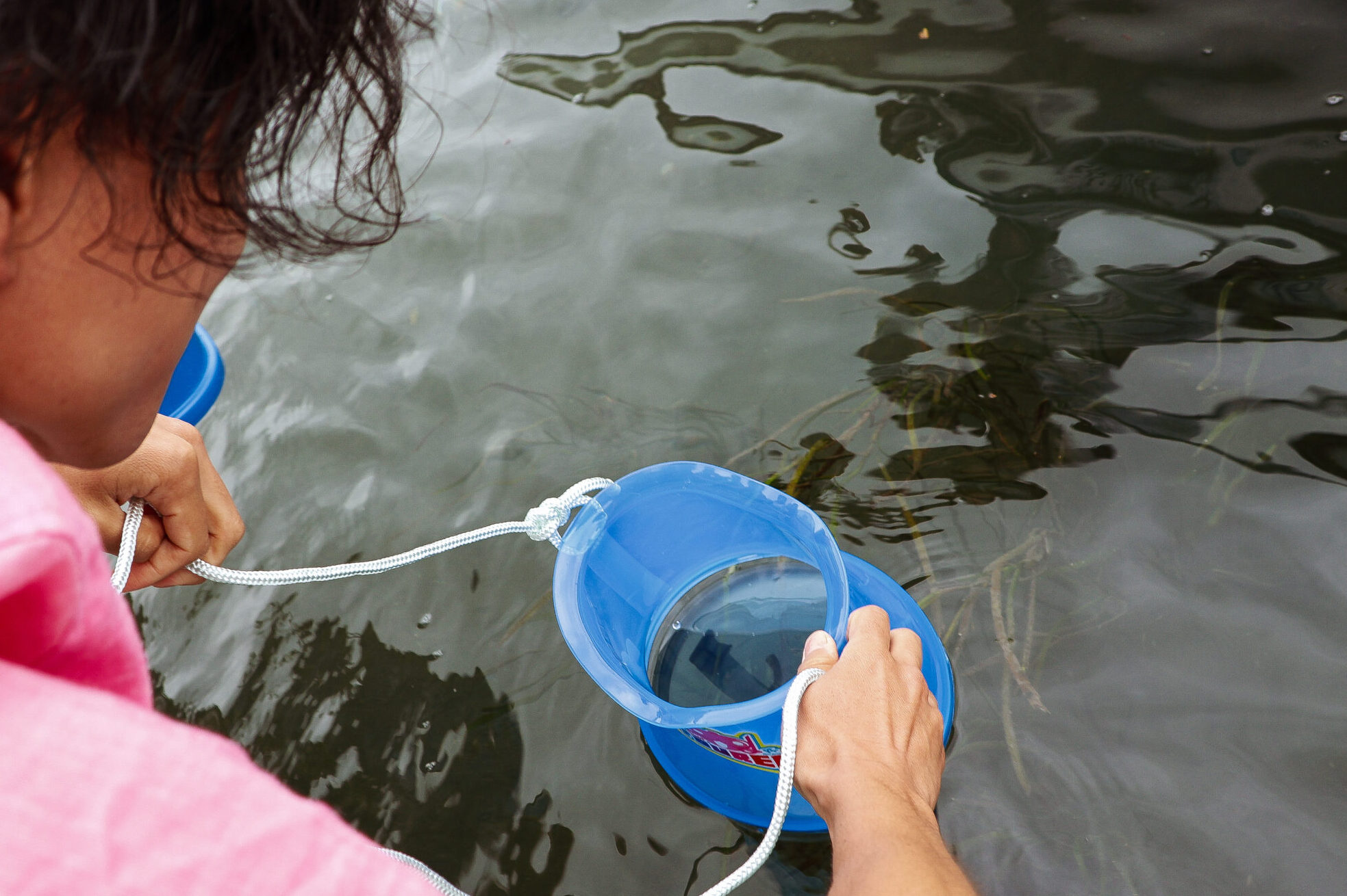 アマモが群生する「アマモ場」に到着したら、水中観察箱メガネ(貸出)を使って、アマモをじっくり観察します。