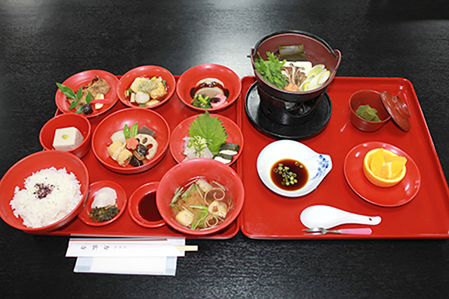 夕食の時間は18時から。季節の素材を生かした精進料理を、同じ敷地内にある食堂でいただきます。