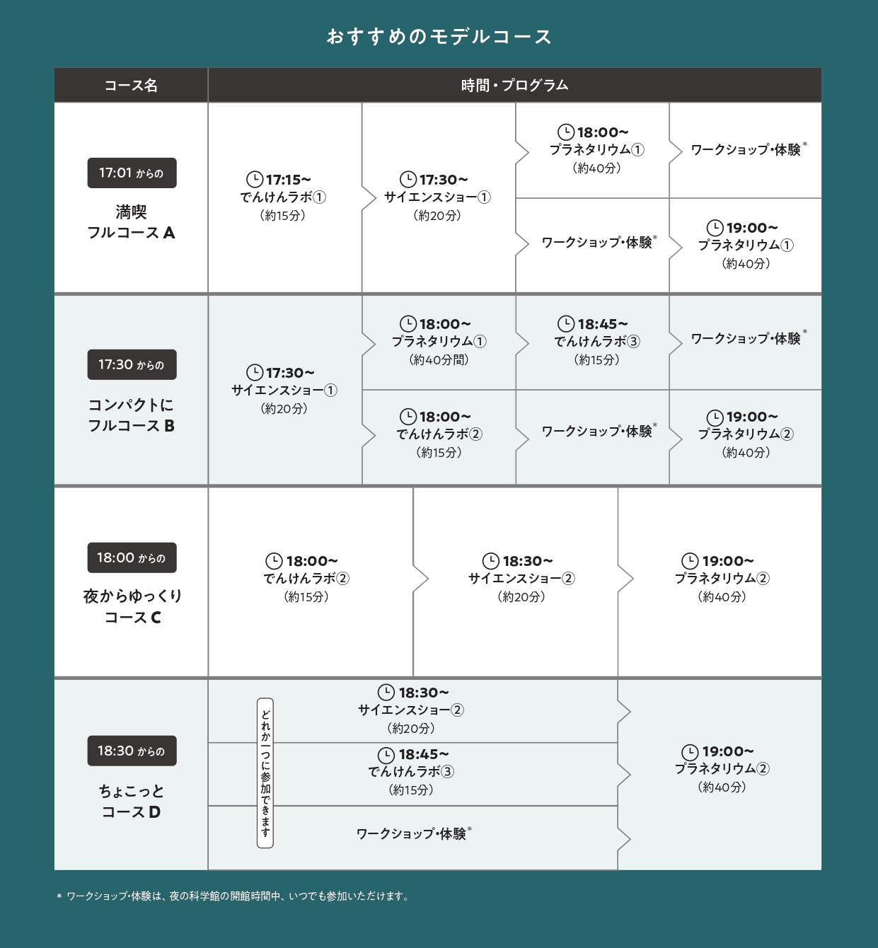 効率的に漏れなく、回っていただくために、入館時間に合わせた4つのモデルコースを参考に、夜の科学館を満喫ください。
