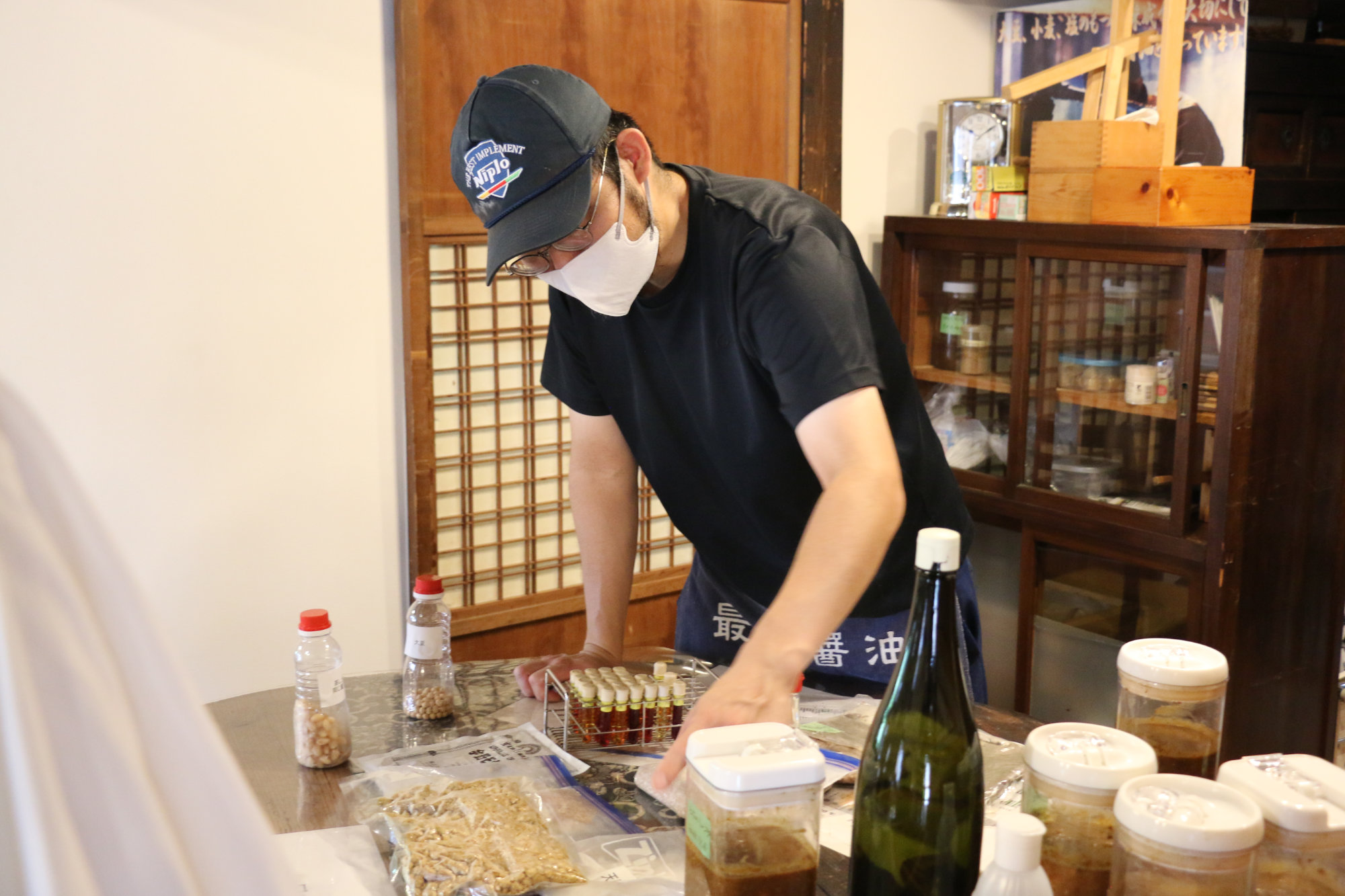 - 搾った醤油を瓶詰め