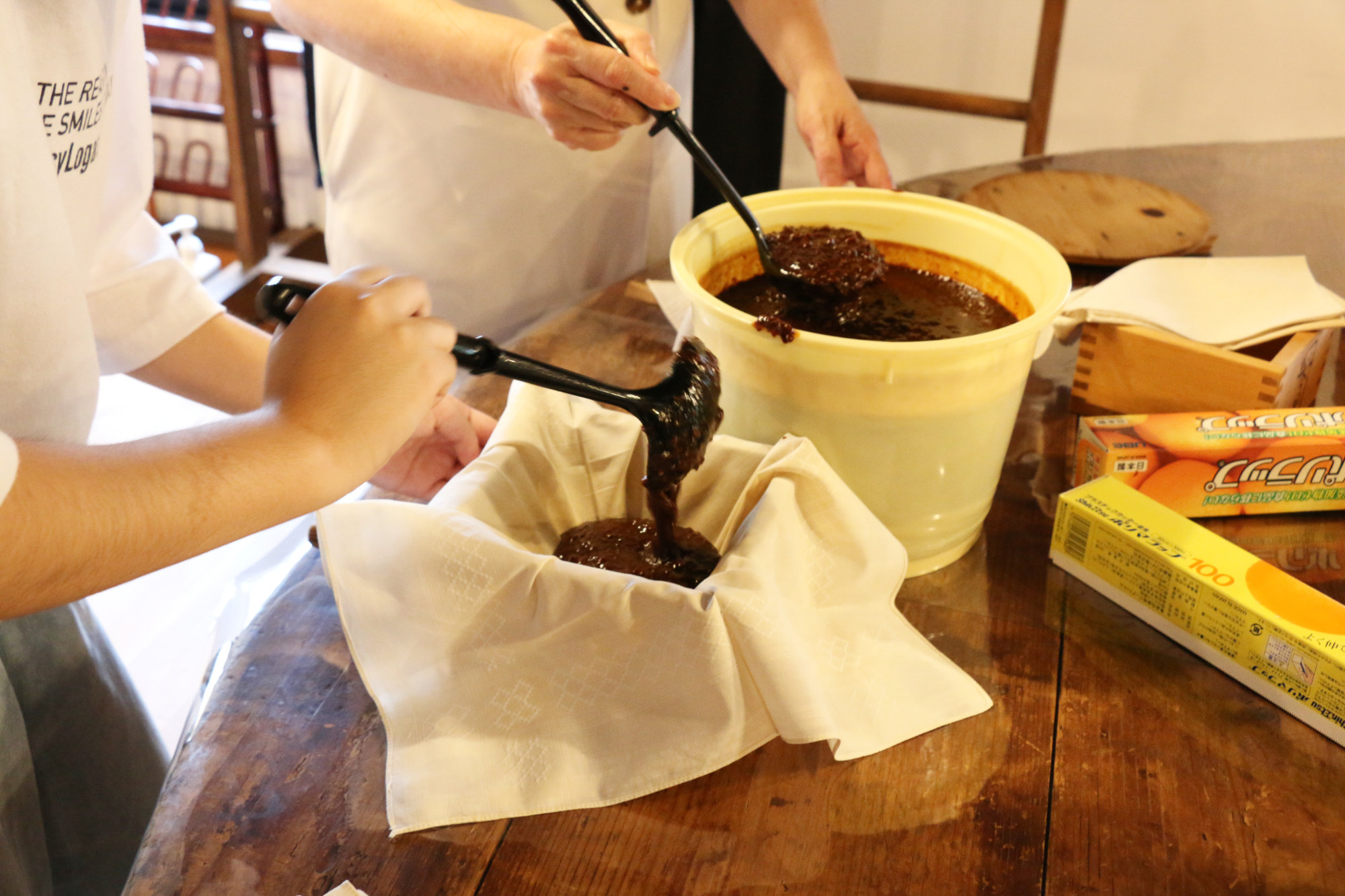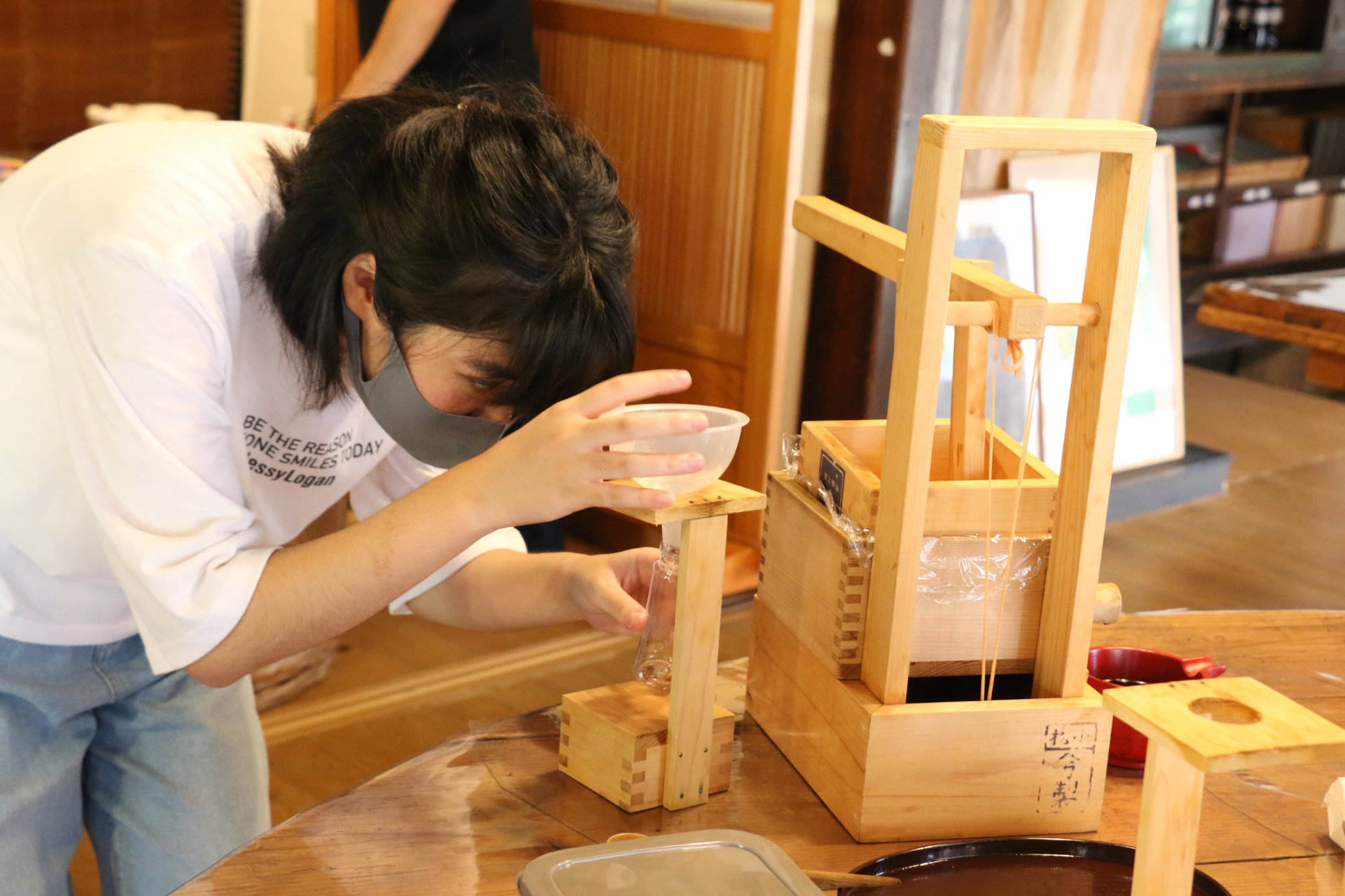 体験では、6代目のレクチャーを受けながら、自らの手で「もろみ」を布袋に入れ、昔ながらの方法で少しずつ圧をかけていきます。静かににじみ出てくるのは、まさに「生まれたて」の醤油。