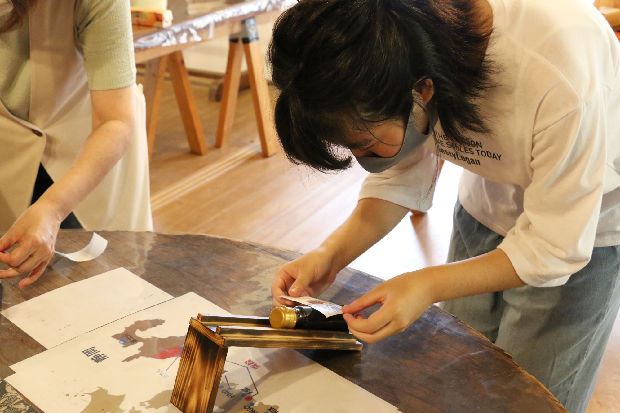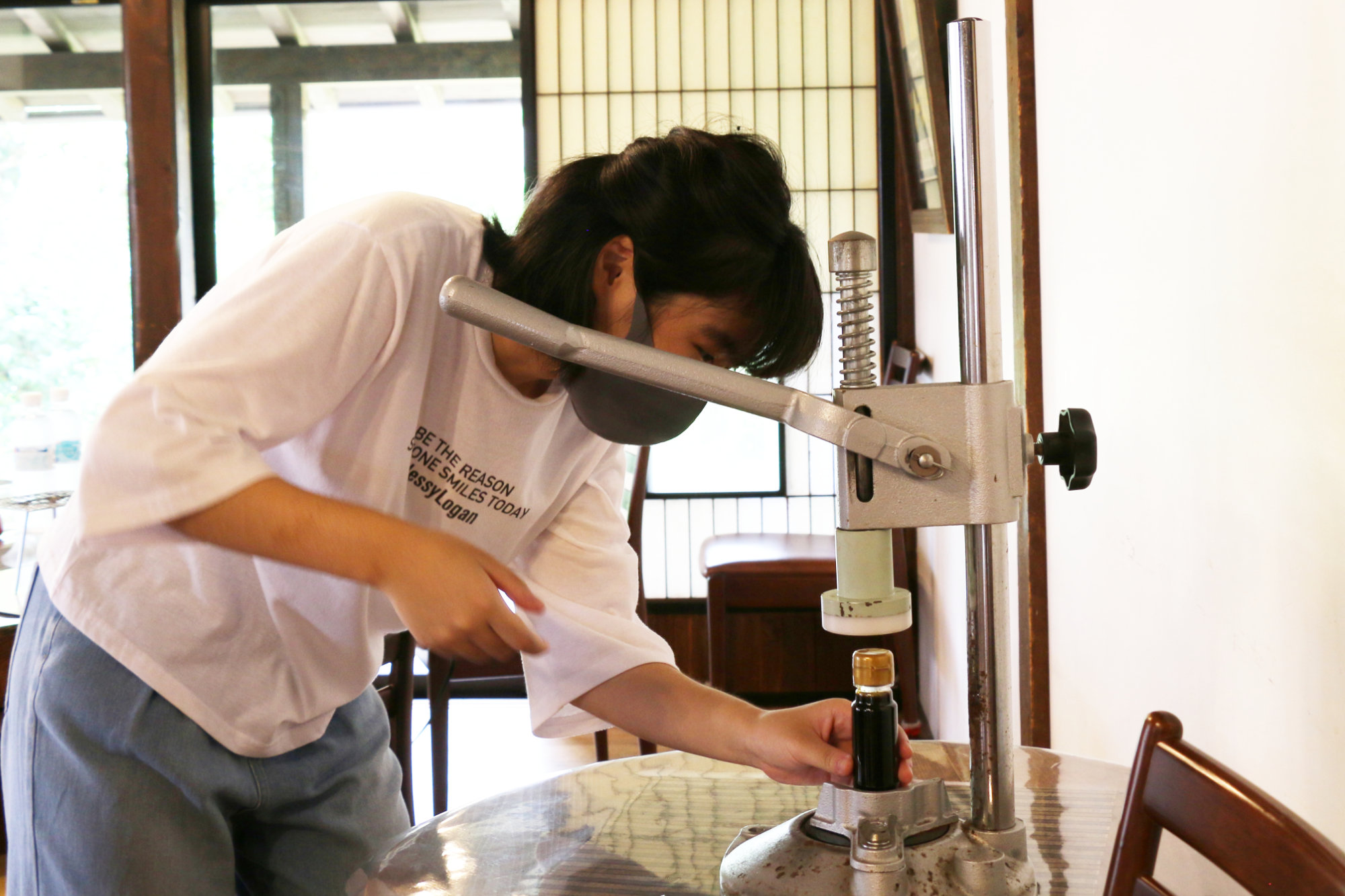 自分で搾った醤油を瓶に詰めて、お土産に手書きのラベルを書き入れれば、世界に一つの特別な一本が完成です。