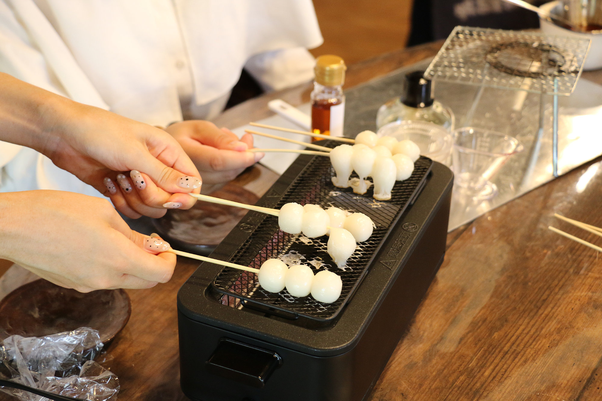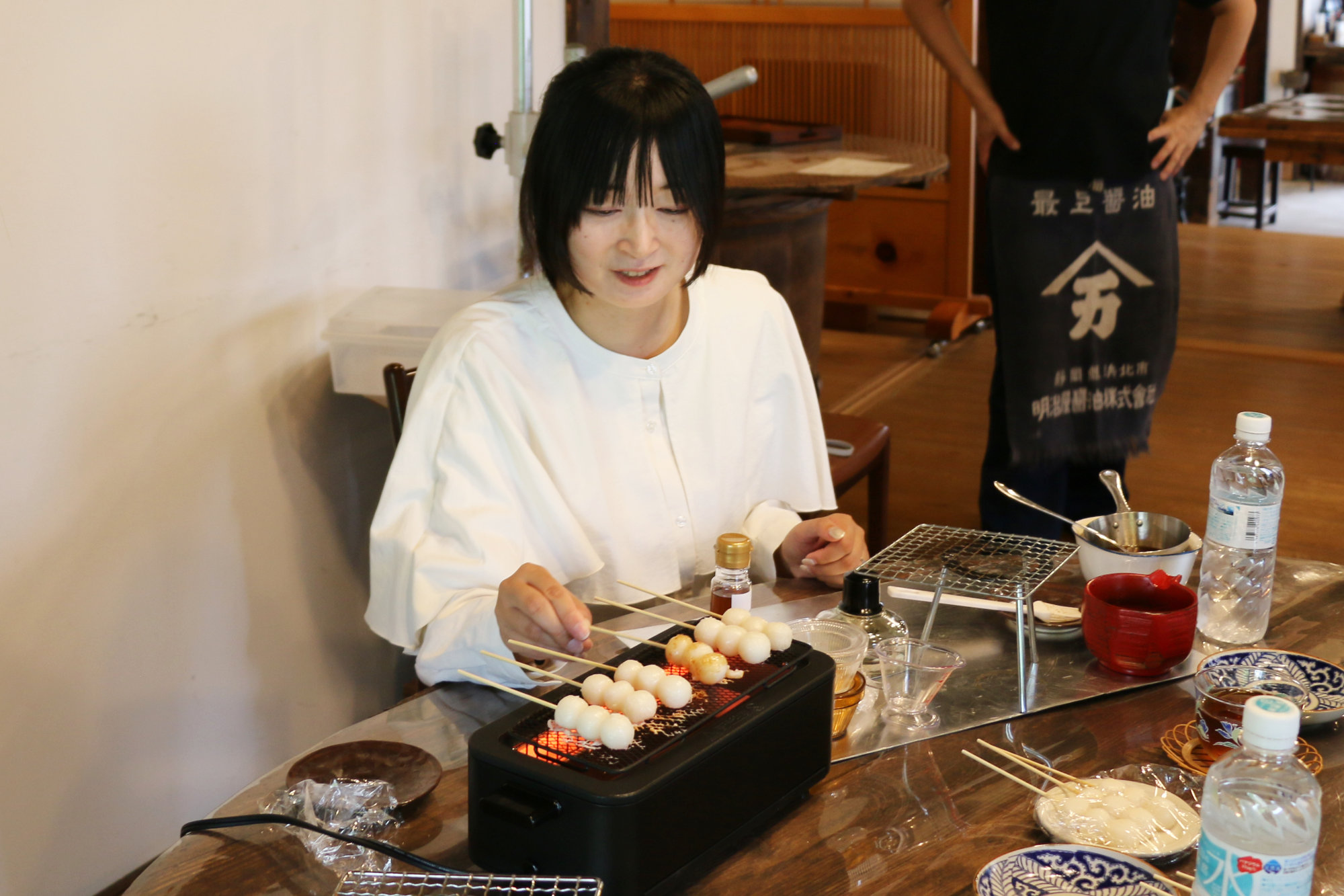 そしてこの体験のもうひとつの醍醐味が、「みたらしだんご作り」。じっくり焼き上げた団子に、さきほど搾ったばかりの醤油でつくったタレをとろりと絡めれば、口の中に広がるのは、香ばしさとほんのりした甘さ、そして深い旨み。