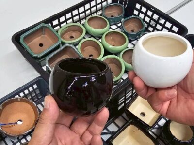 盆栽が決まったら、次に合わせる鉢を選びます。鉢は形・色・材質など種類が豊富です。
