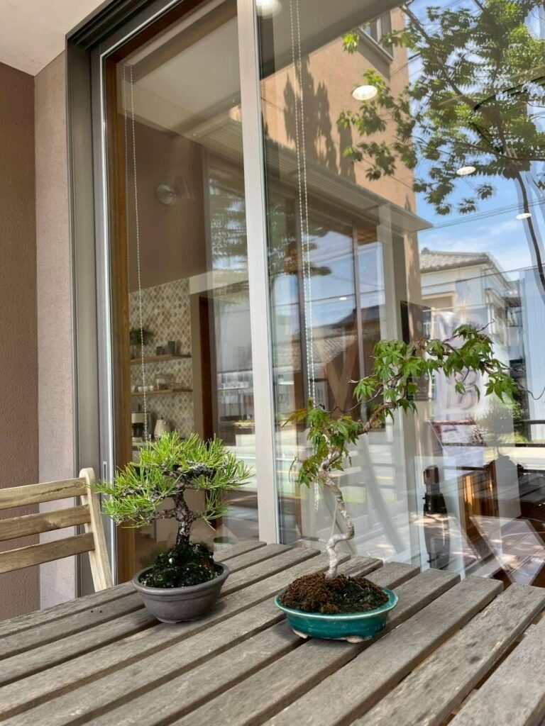 同店では、盆栽の展示販売のほか、初心者向けの盆栽教室やメンテナンス、盆栽鉢や道具の販売も行っています。