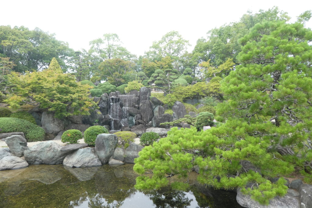 その敷地内にある「百景園」は、約4,000平方メートル(約1,200坪)という広さの“回遊式日本庭園”で、庭石や池、滝を配した本格的な和風庭園。