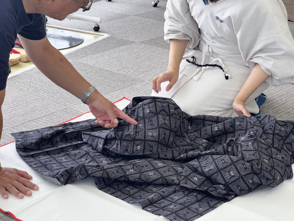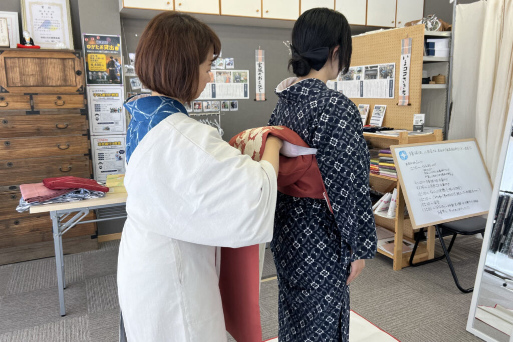続いて、着付け体験へ。刑部さんの丁寧なサポートのもと、織機で織られた着物を身にまとい、帯や小物を使って自分だけのコーディネートを完成させます。普段の自分とは違う姿に、背筋が自然と伸びていくのを感じられます。