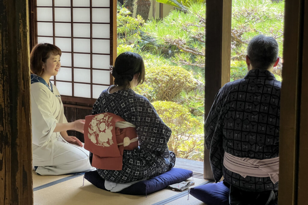 体験はお茶の提供からスタート。ほっと一息つきながら、当日のスケジュールや織機で織られた着物の背景といったお話しを聞きます。