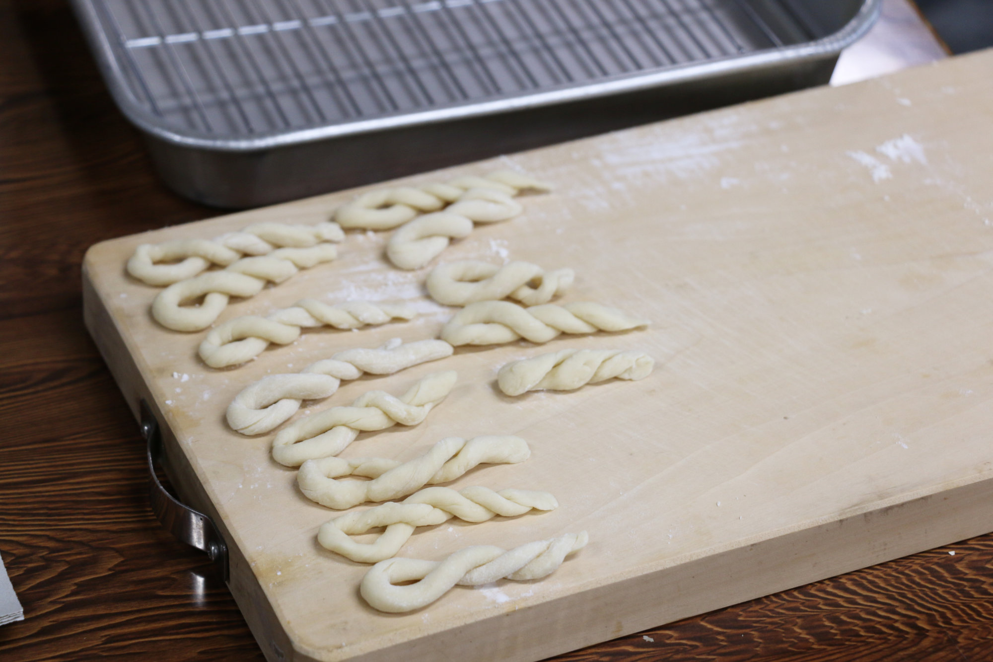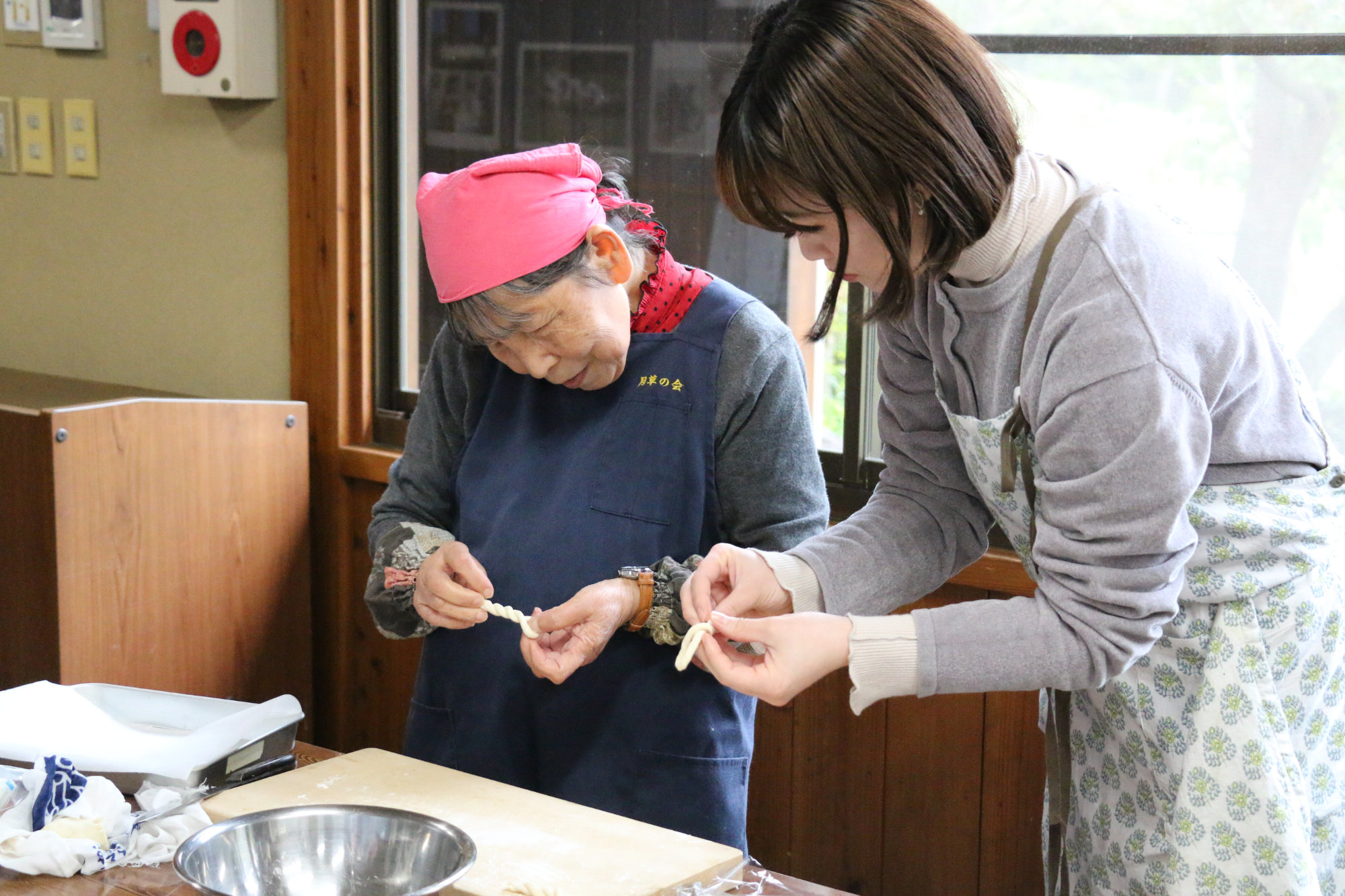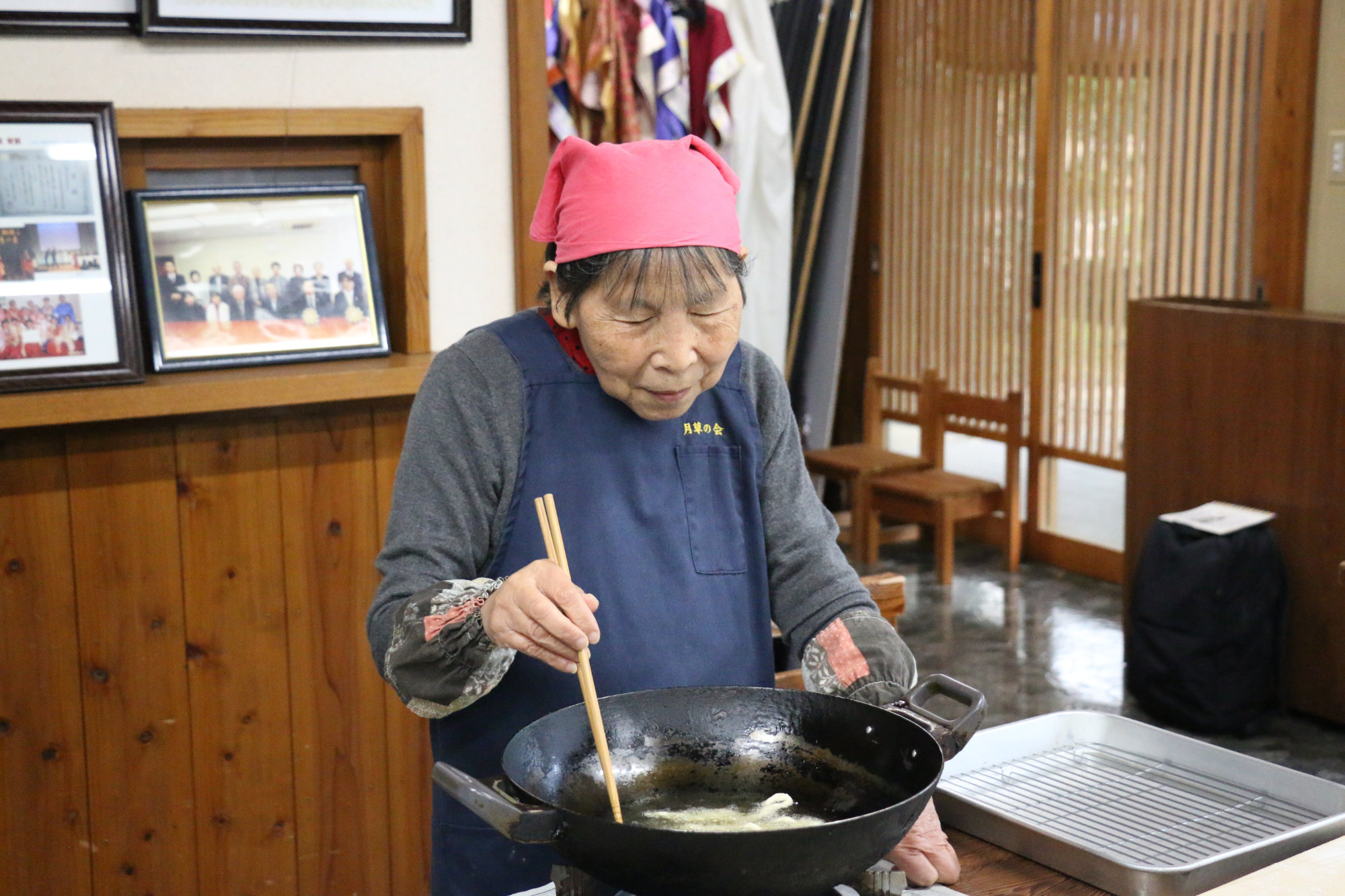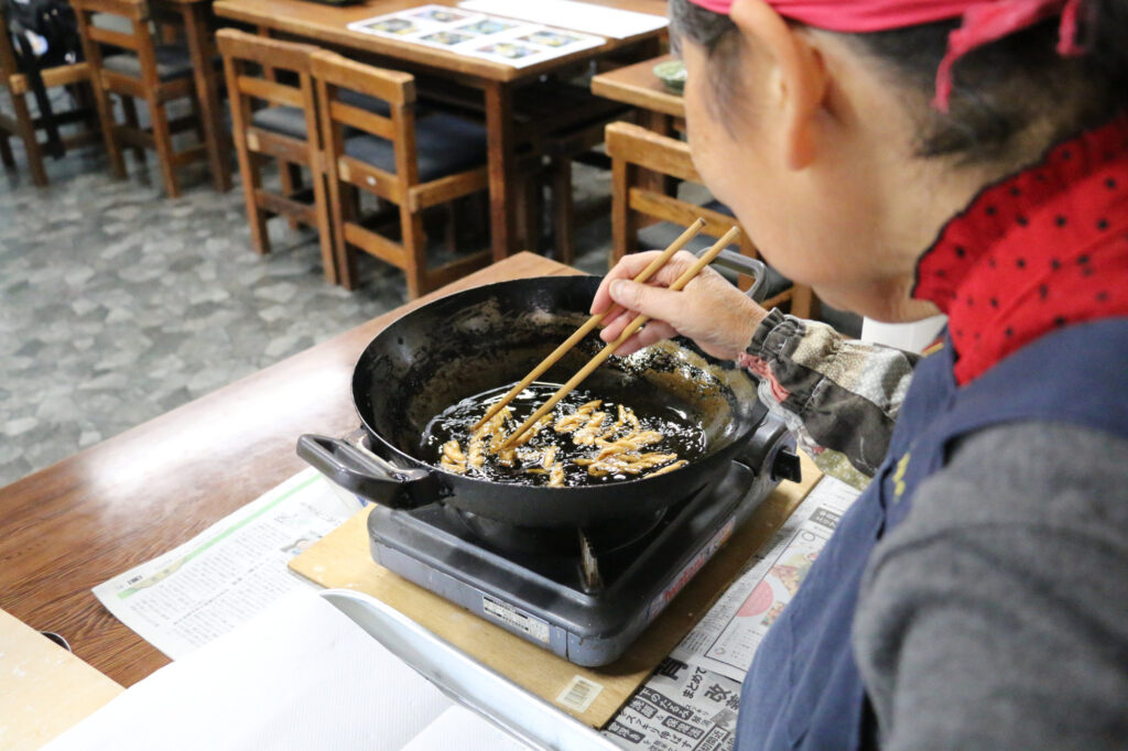 続いては「唐菓子(とうがし)」という、当時の素朴な揚げ菓子づくり。小麦粉と少量の砂糖を練り、油でじっくりと揚げていきます。焦げないよう見守る時間もまた楽しく、きつね色に染まった菓子を口にすれば、香ばしさの奥にほんのりとした甘みを感じます。