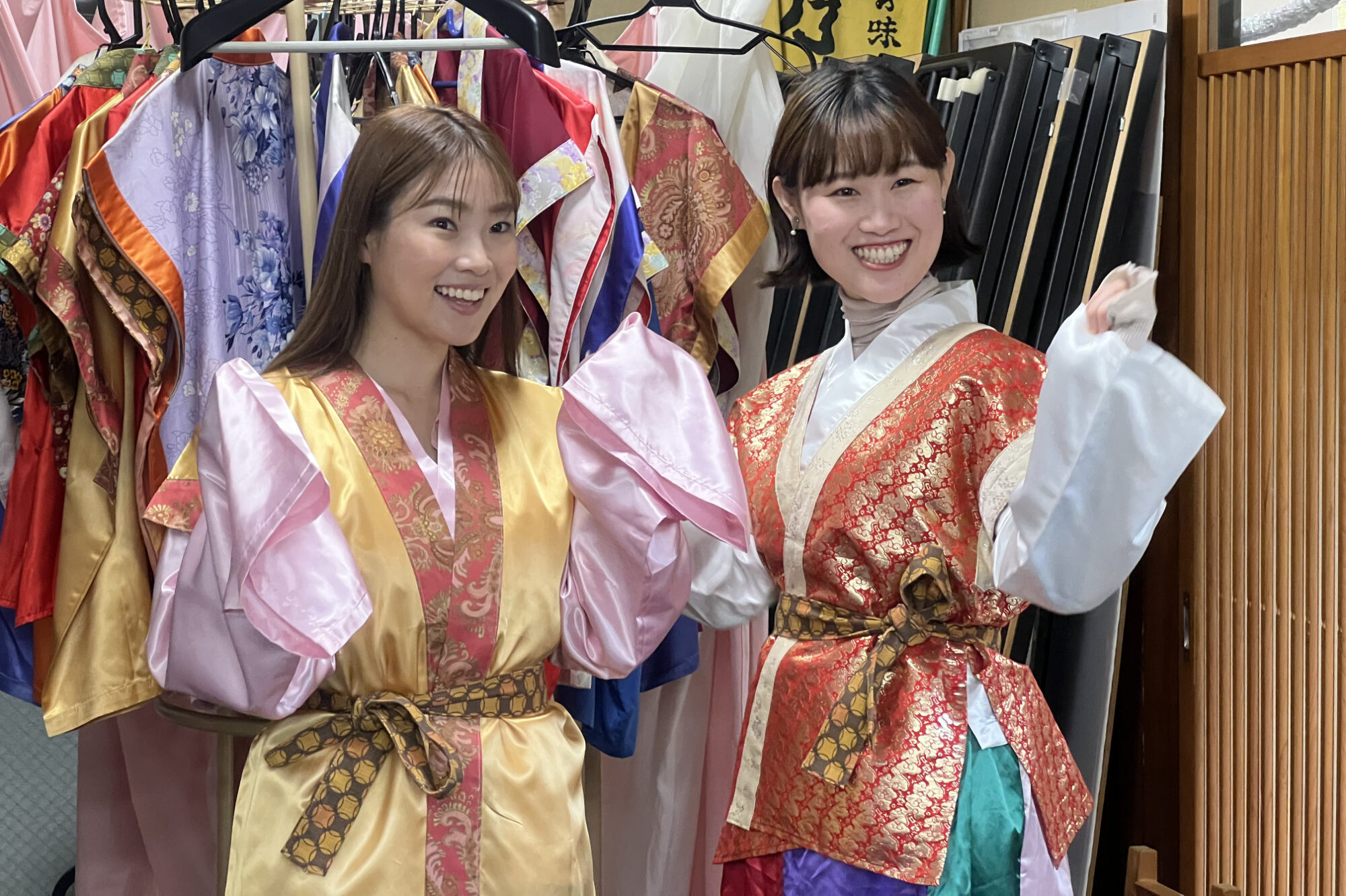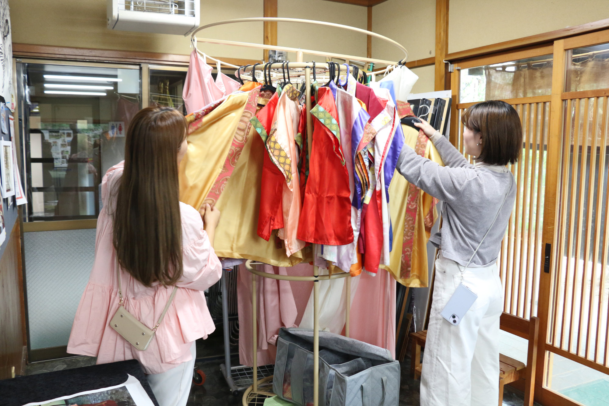 調理を楽しんだ後は、色とりどりの万葉衣装から好きな一着を選び、着付け体験。鮮やかな布や繊細な文様に身を包むと、まるで古代の貴族になったかのような気分が味わえます。