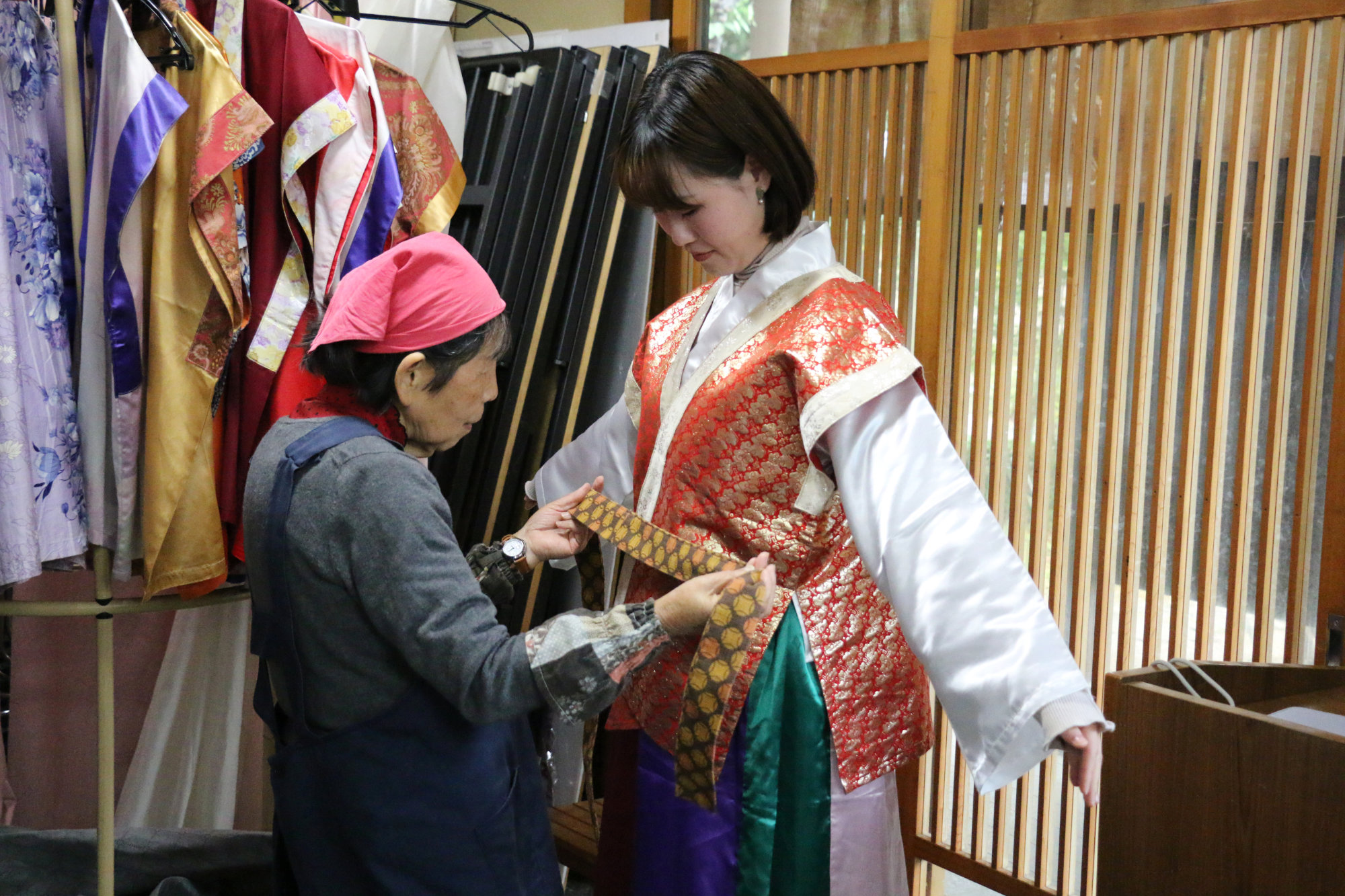 調理を終えた後は、色とりどりの万葉衣装から好きな一着を選び、着付けを体験します。鮮やかな色彩や繊細な文様の衣装は、それぞれに個性があり、選ぶ段階から気持ちが弾みます。