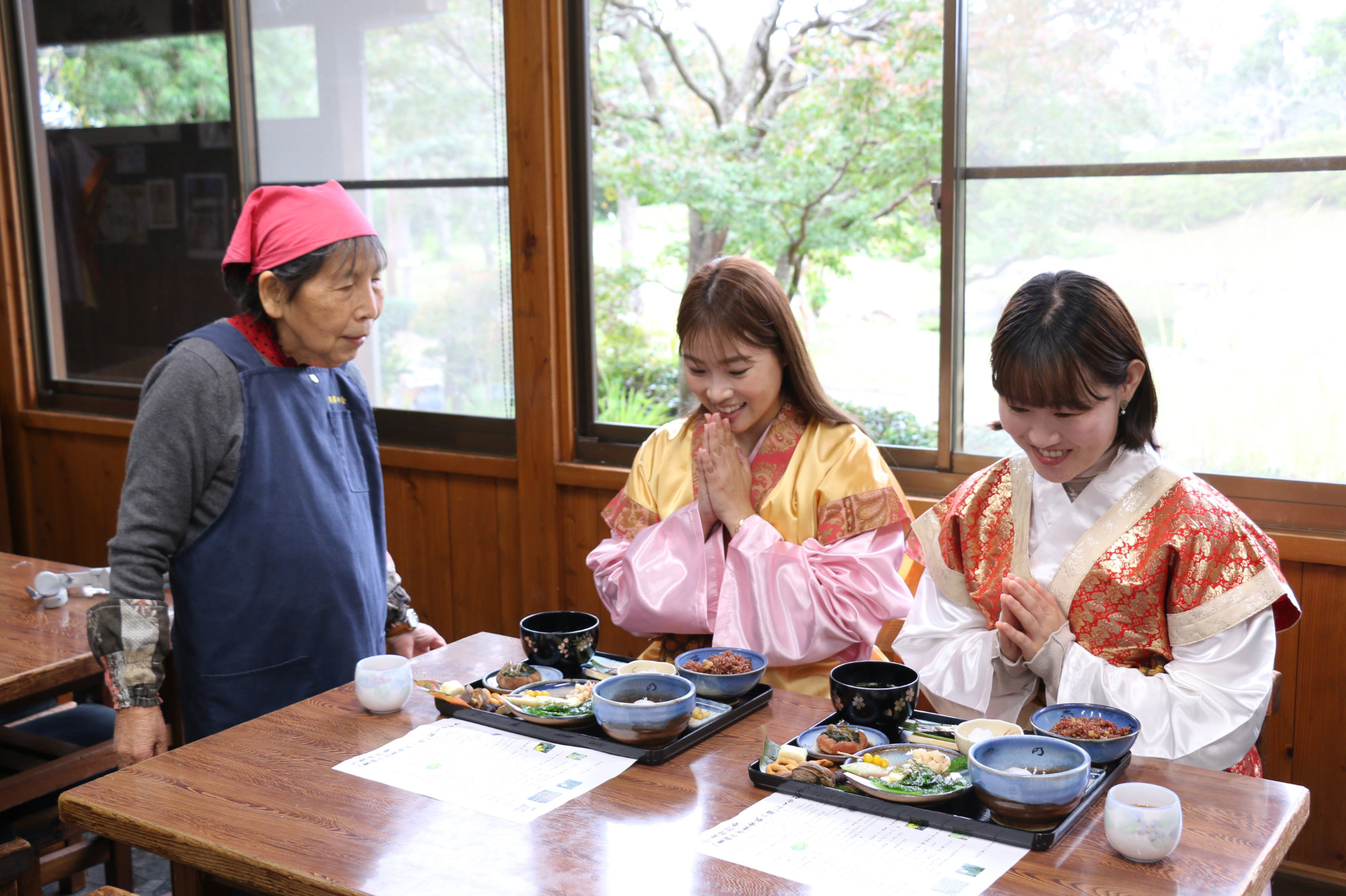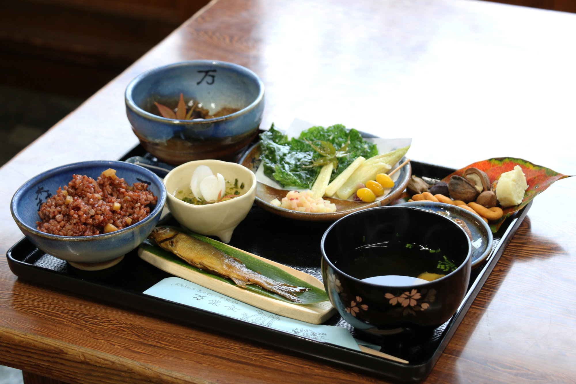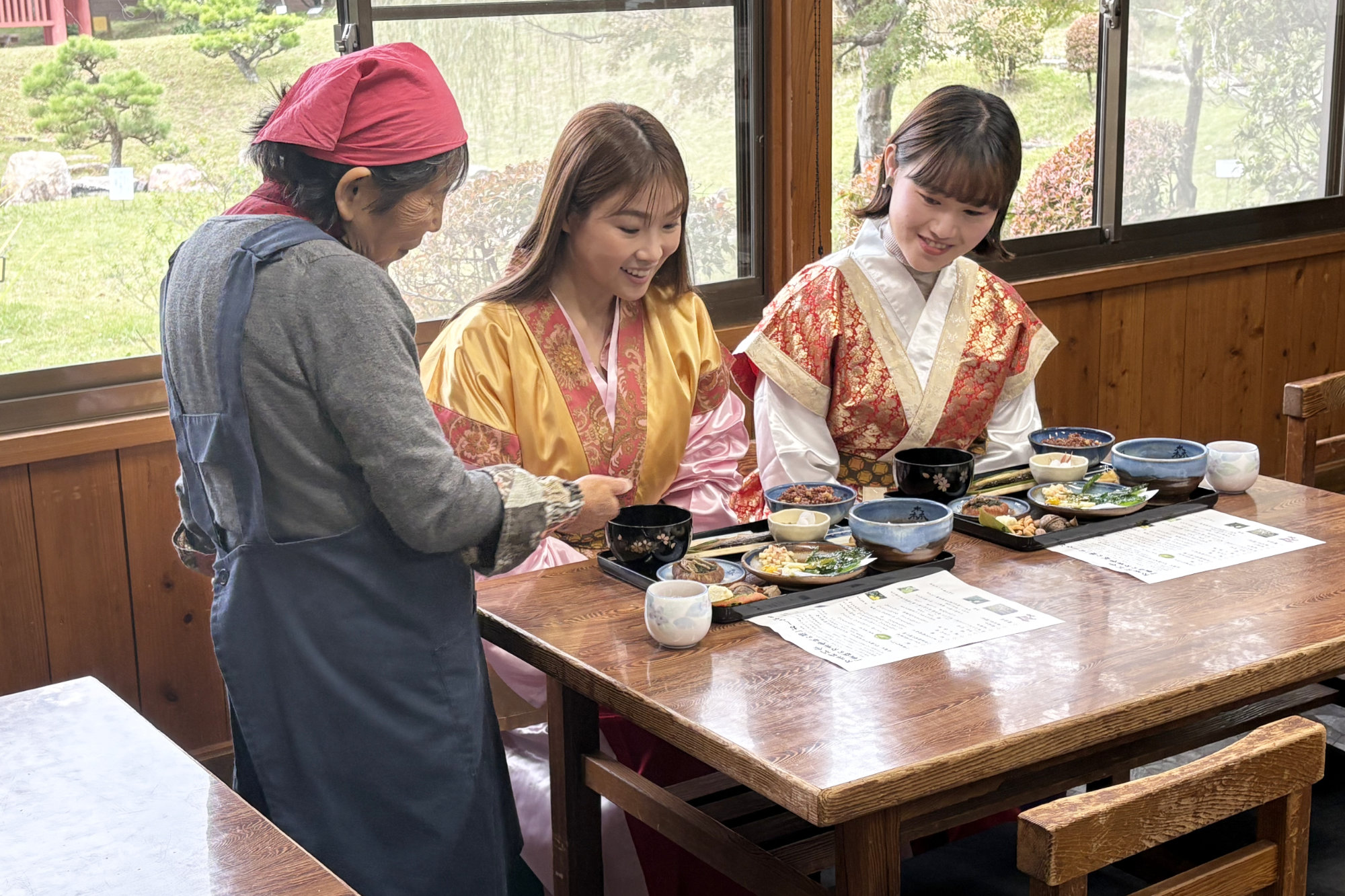衣装を整えたら、膳を囲む時間です。園内や地元の山で採れた野草や木の実を使い、化学調味料や砂糖を控えた古代の味わいを、香りや彩りとともにゆっくり味わえます。