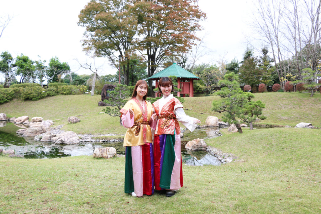 万葉衣装に身を包み、園内を歩くと、まるで万葉の貴人になったかのような心地に。現代の装いでは感じられない、時を越えた静かな体験が、心にそっと残ります。