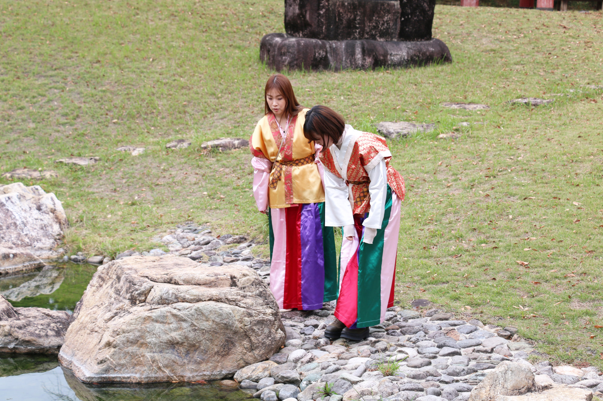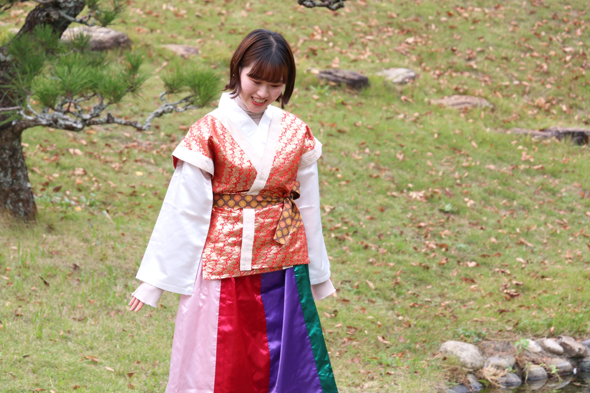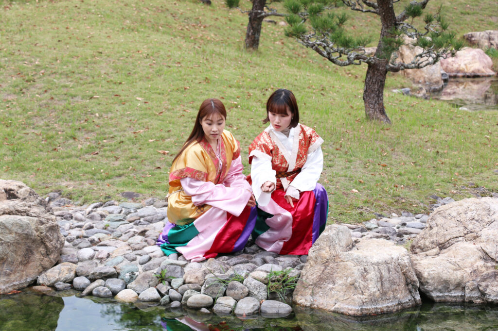 食後は、公園内の曲水庭園を自由に散策。万葉衣装を身にまとい、庭園を歩いたり記念撮影をしたりしながら、五感で非日常の空気を感じられます。