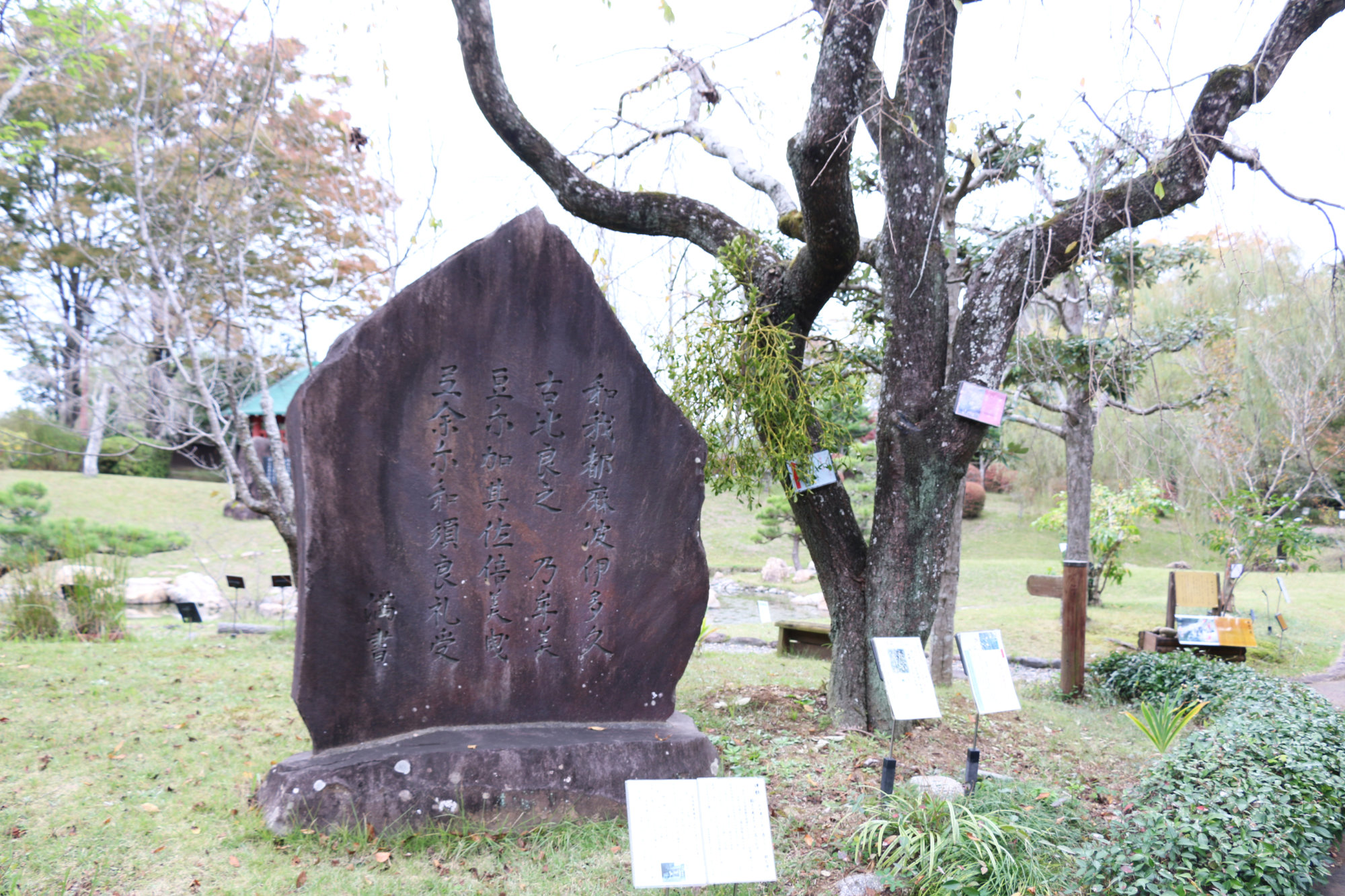 食後は、古代の貴族が曲水の宴を催した「曲水池」や、法隆寺の夢殿を模した「曲水亭」を中心とした庭園をゆっくり散策。風にそよぐ木々の音や、池に映る光、万葉歌の石碑に刻まれた文字に目を留めながら、静かな時間を過ごせます。