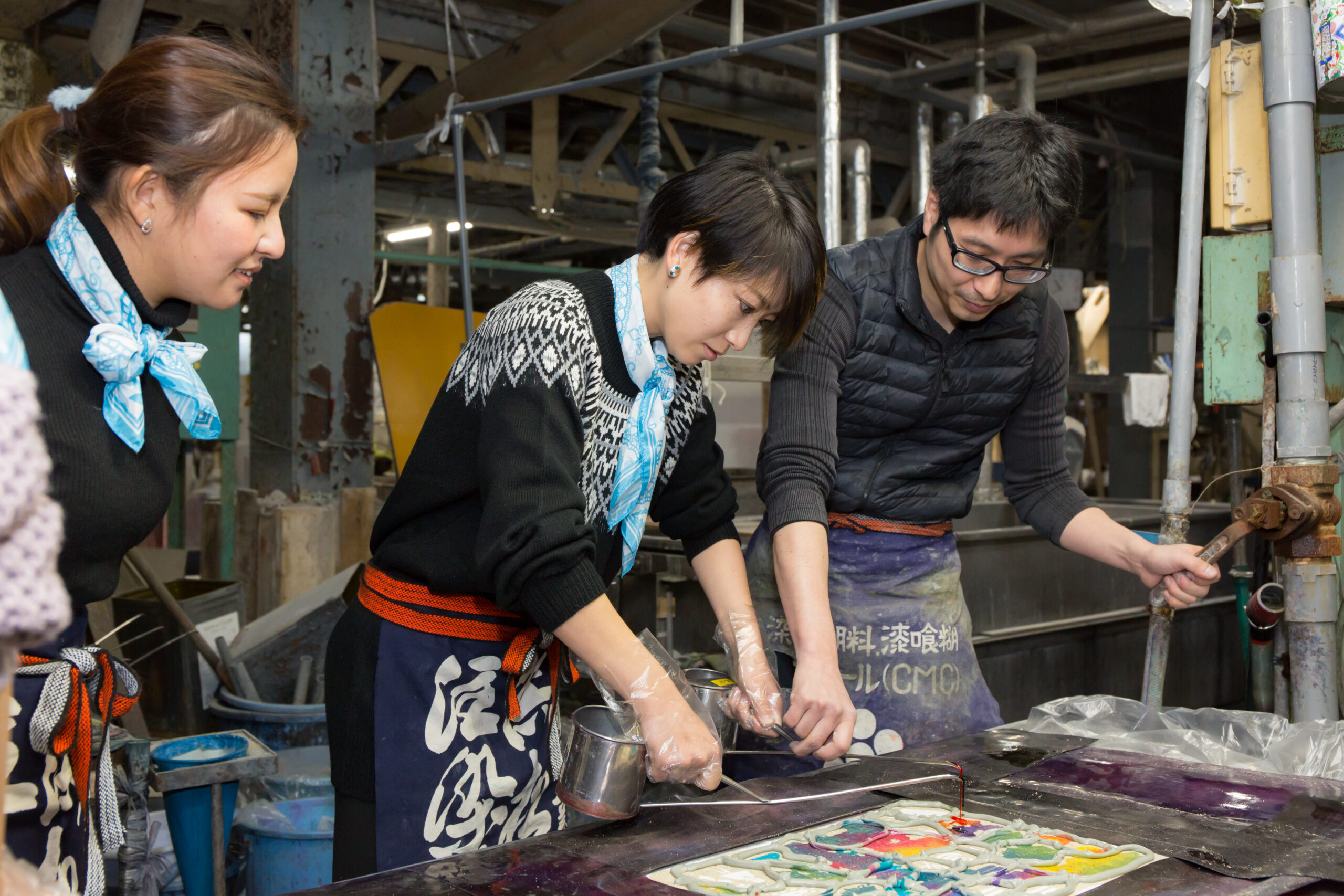 注染そめは工程の中で専用の「やかん」からお好みの色の染料を注いでいくところがあり、たまに飛び散ることもありますのでそのあたりを考慮した履物、服装をお勧めいたします。また、大変に歴史のある工場での作業となりますのでヒールなどは避けていただいた方がよろしいかと思います。