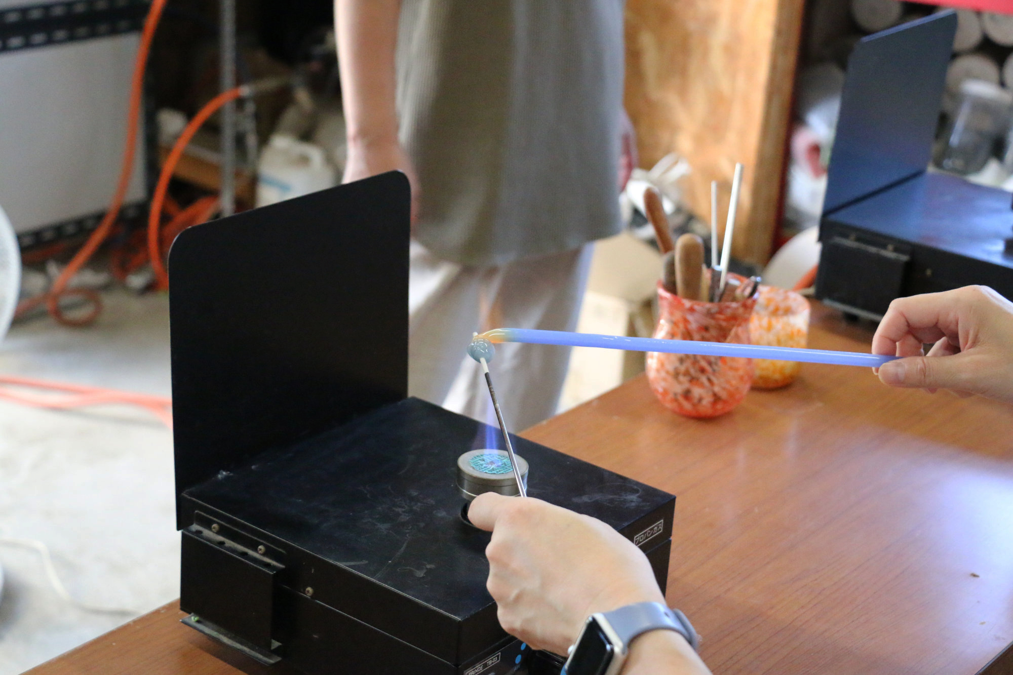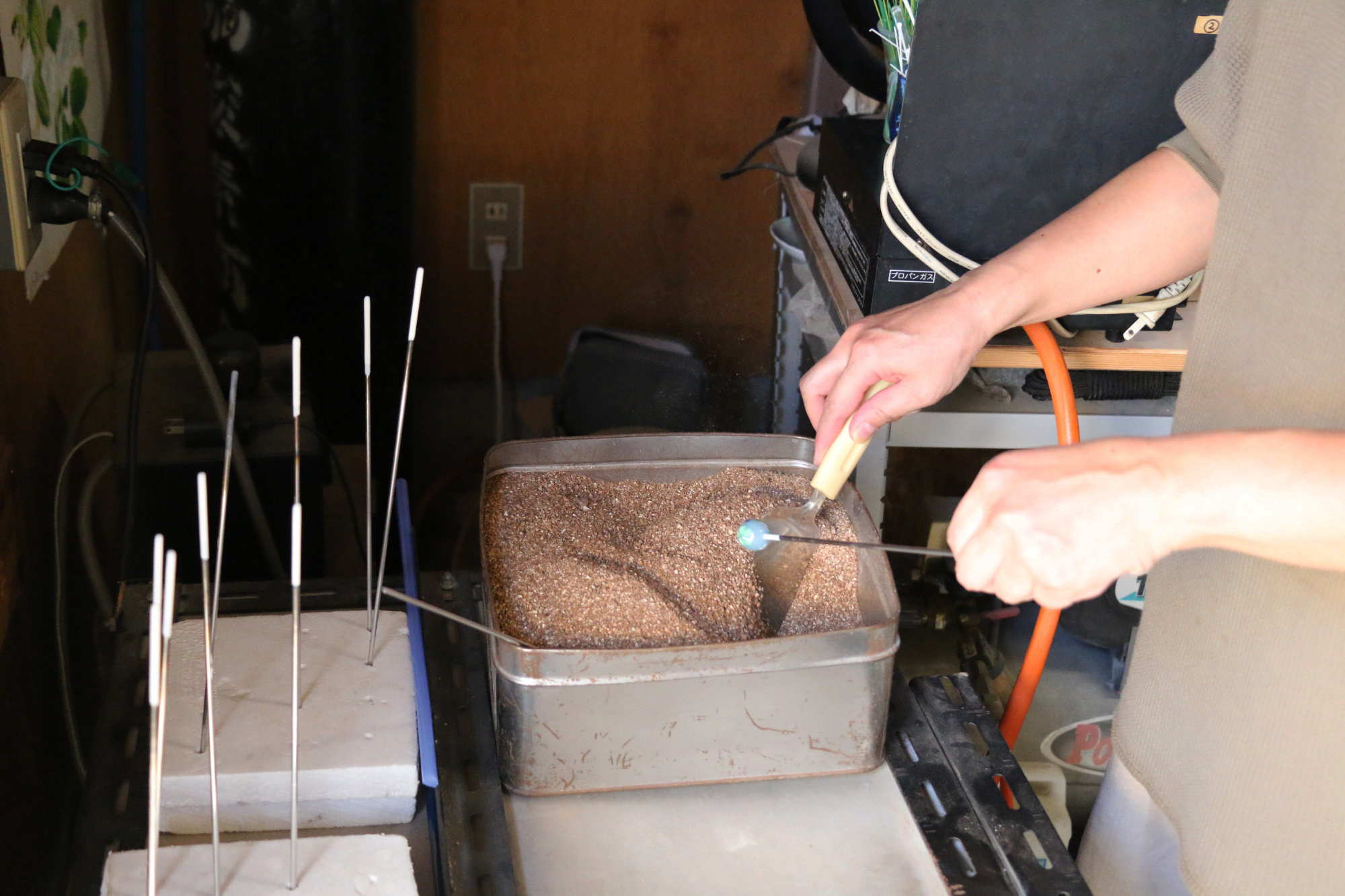 デザインが決まったら、バーナーの炎でガラス棒を溶かし、芯棒に巻き取って玉の形をつくっていきます。熱を加えるとガラスは柔らかくなり、息をのむほど滑らかに表情を変えていきます。