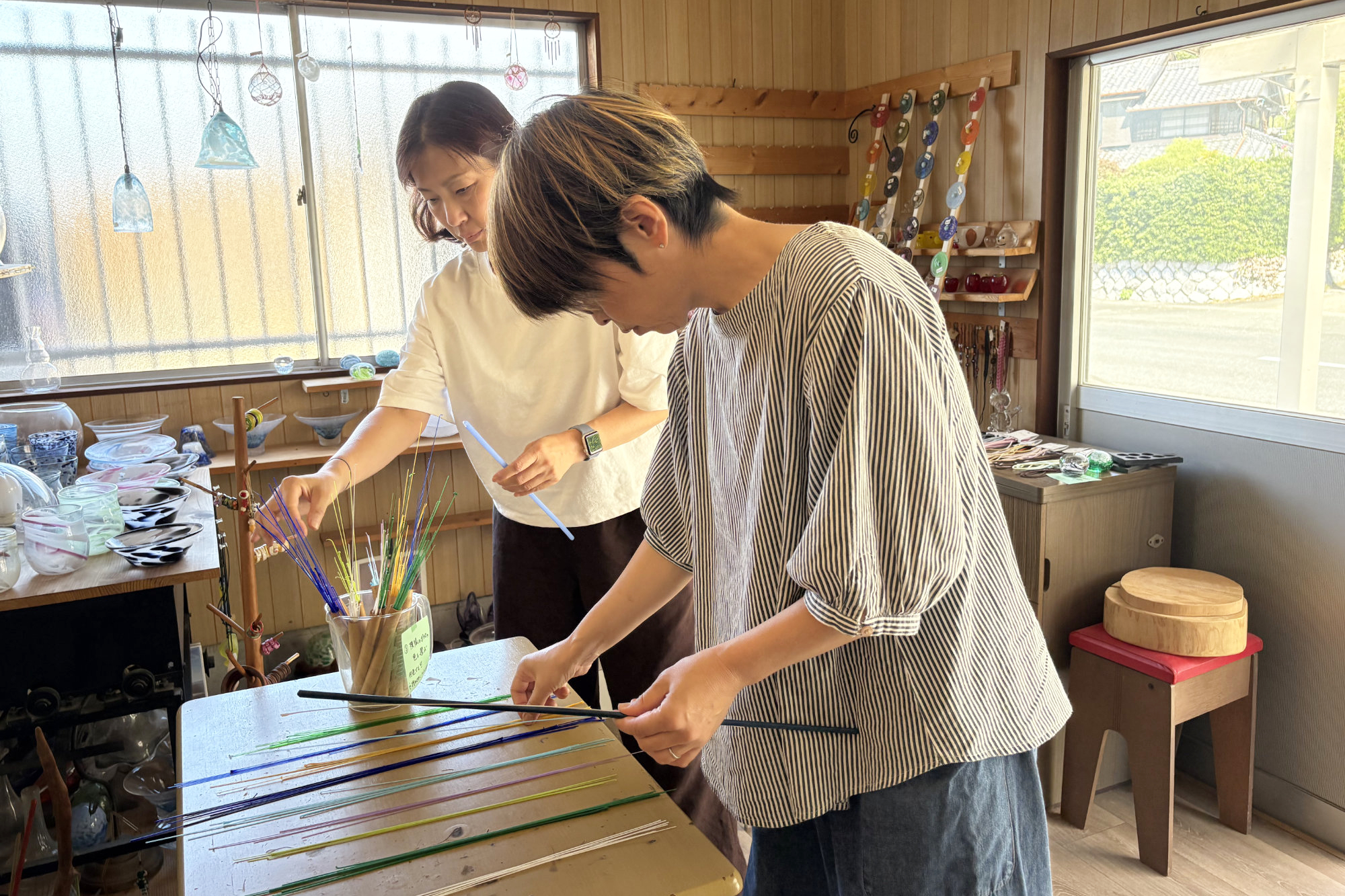 まずは色や模様をじっくり選び、自分だけのデザインを決めたら制作に取りかかります。ガラスを溶かし、色ガラスを重ね、少しずつ形を整えていく工程は、手と目で確かめながら進める集中の時間です。
