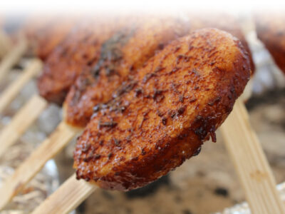 突いたお米を串に付け、定番商品である水車みそをベースに生姜やゴマを加えたオリジナルの味噌を付け、じっくり炭火で焼き上げます。