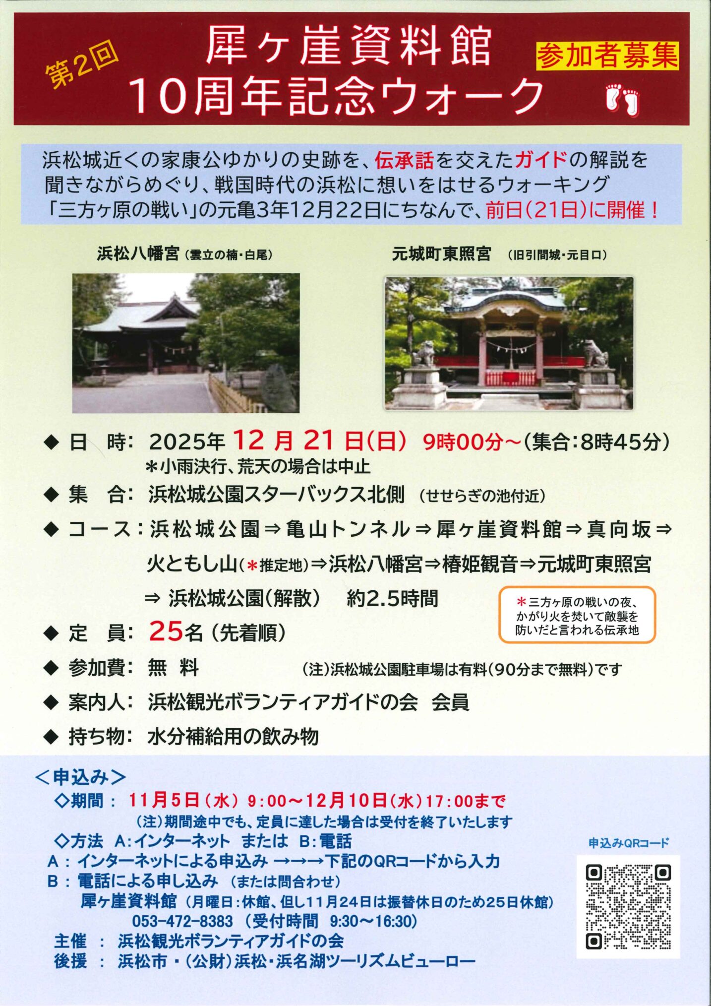 犀ヶ崖資料館にリニューアルオープンしてから10年が経過します。そちらを記念して、三方原合戦と家康公ゆかりの地をめぐるガイドウォークを開催いたします。