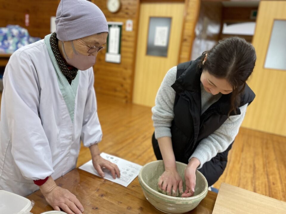「そば打ちは、各家庭でおこなわれてきたんだよ」とくんまの暮らしについてお聞きしながら、体験がスタートします。