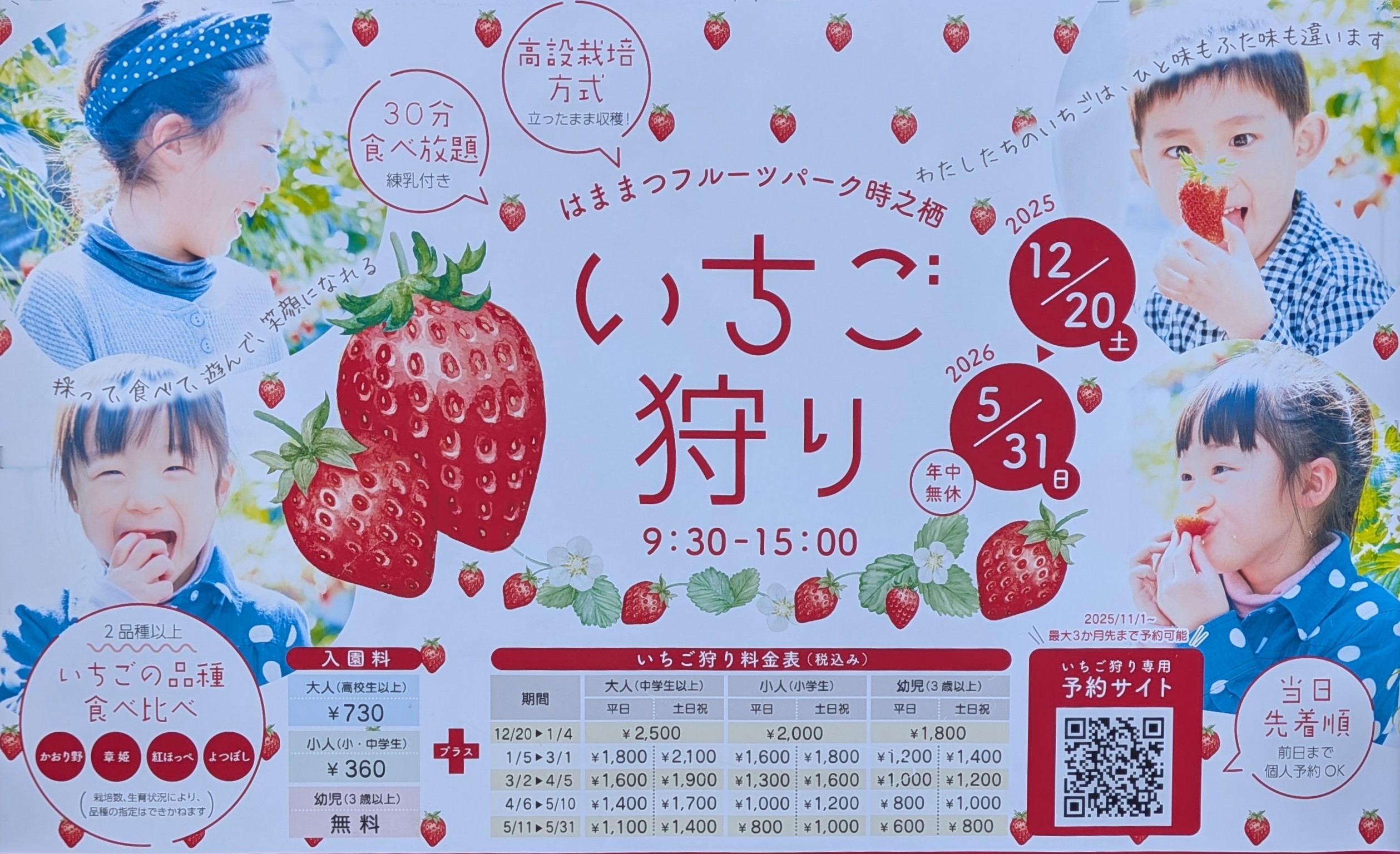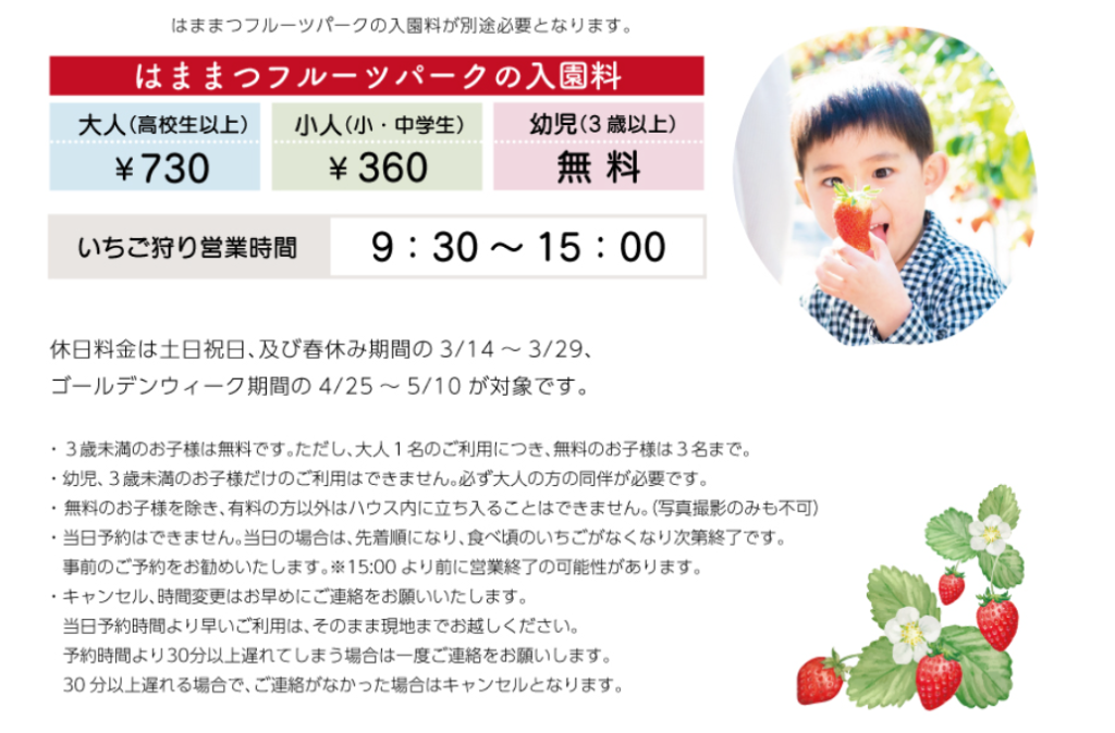 2026年 2 月 9 日(月)~2026年 4 月 5 日(日) 9:30〜15:00 受付順にご案内いたします。(いちご狩りは30分間)