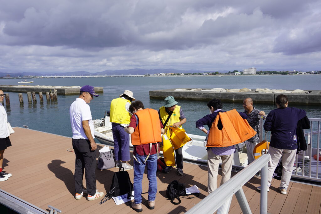 2.船での注意事項などの説明を聞いた後、ライフジャケットを着用して乗船