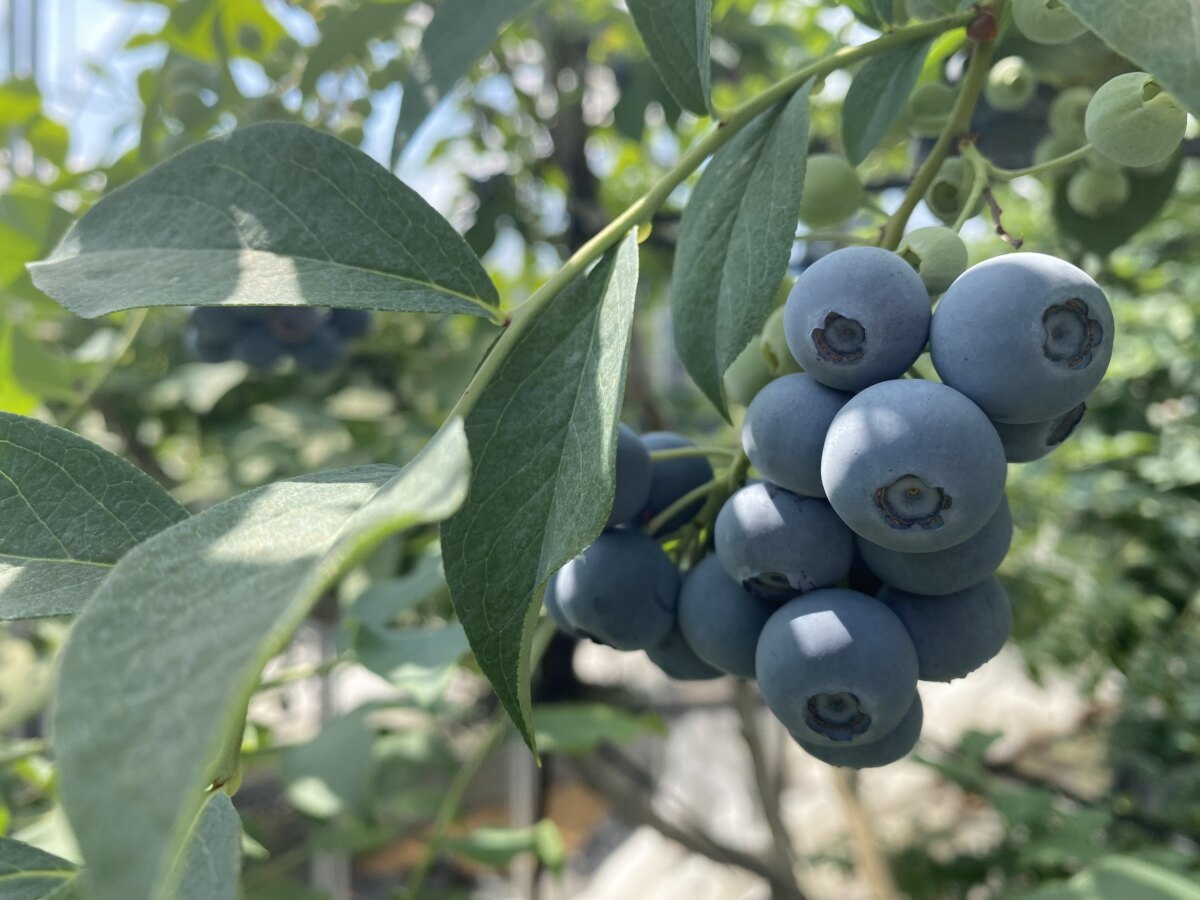 かたまりで実っているブルーベリーが全体的に色づいているほうが熟していて食べ頃だそう。