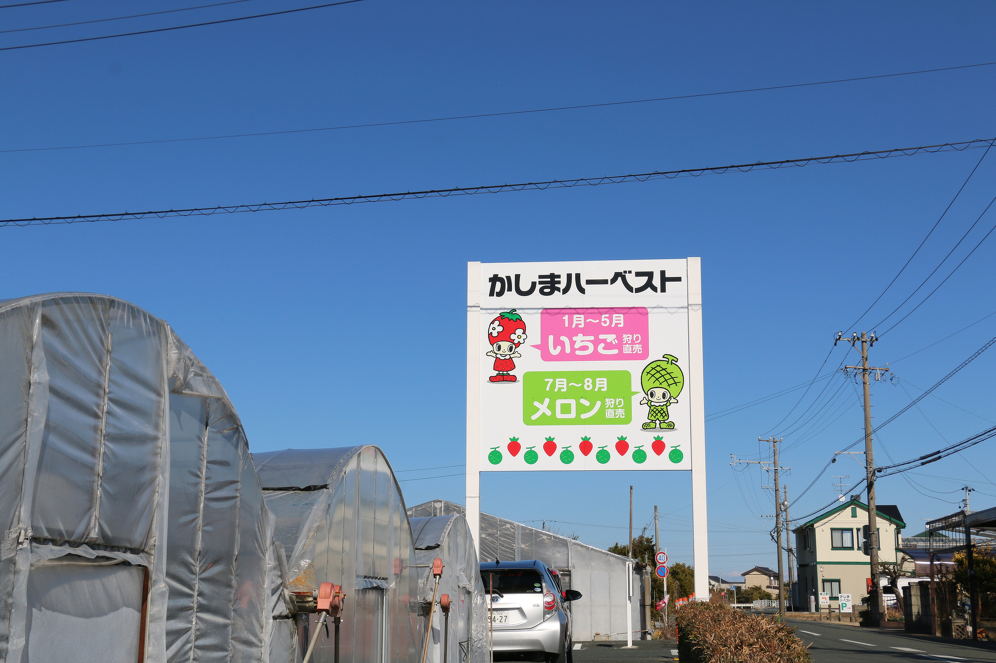 いくつものビニールハウスが並ぶ、のどかな風景の中に、かわいらしいいちごとメロンの看板が見えてきます。