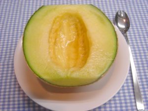2.その後、先に収穫して冷やしておいたマスクメロンをお一人半玉(1/2カット)贅沢にスプーンですくってお召し上がりいただきます。